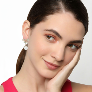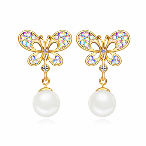 Elegantes aretes en baño de oro amarillo de 18 quilates, diseño de mariposa con detalle de perla blanca con incrustaciones de cristales en color tornasol. Fabricado en una estructura de aleación de platino con rodio sin níquel.