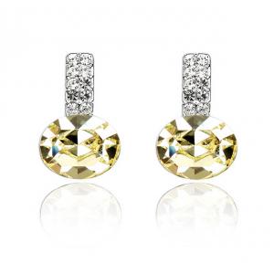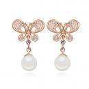 Elegantes aretes en baño de oro amarillo de 18 quilates, diseño de mariposa con detalle de perla blanca con incrustaciones de cristales en color tornasol. Fabricado en una estructura de aleación de platino con rodio sin níquel.