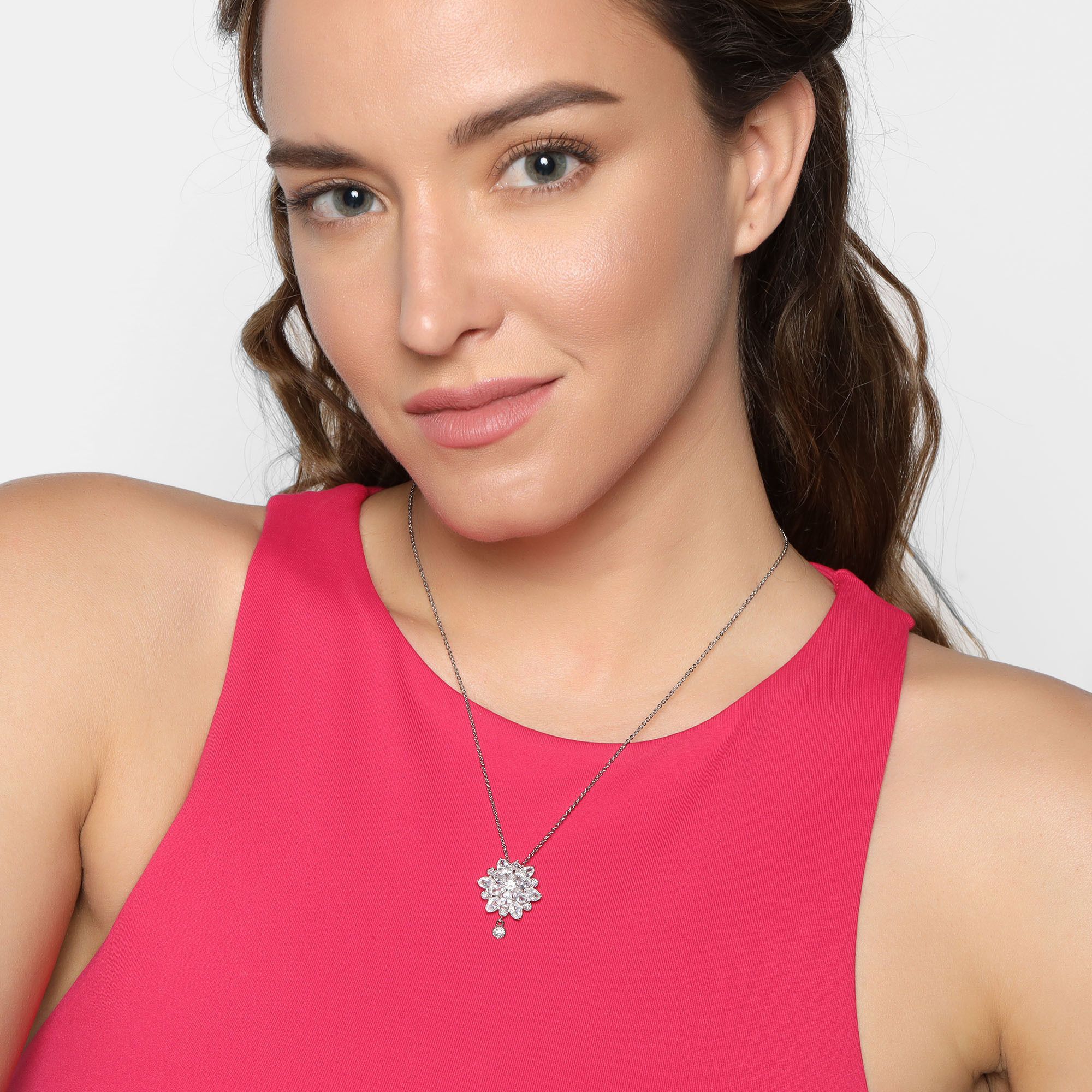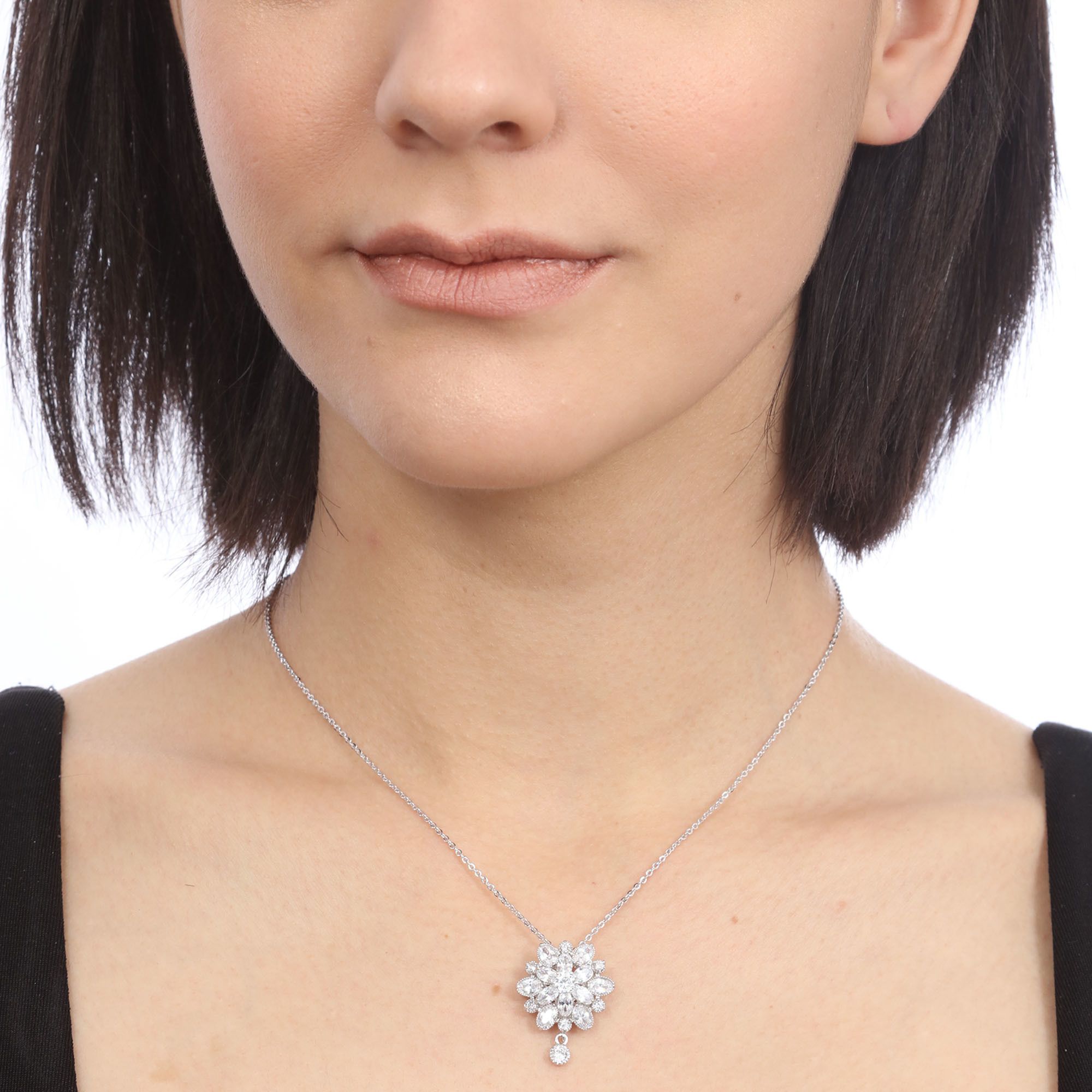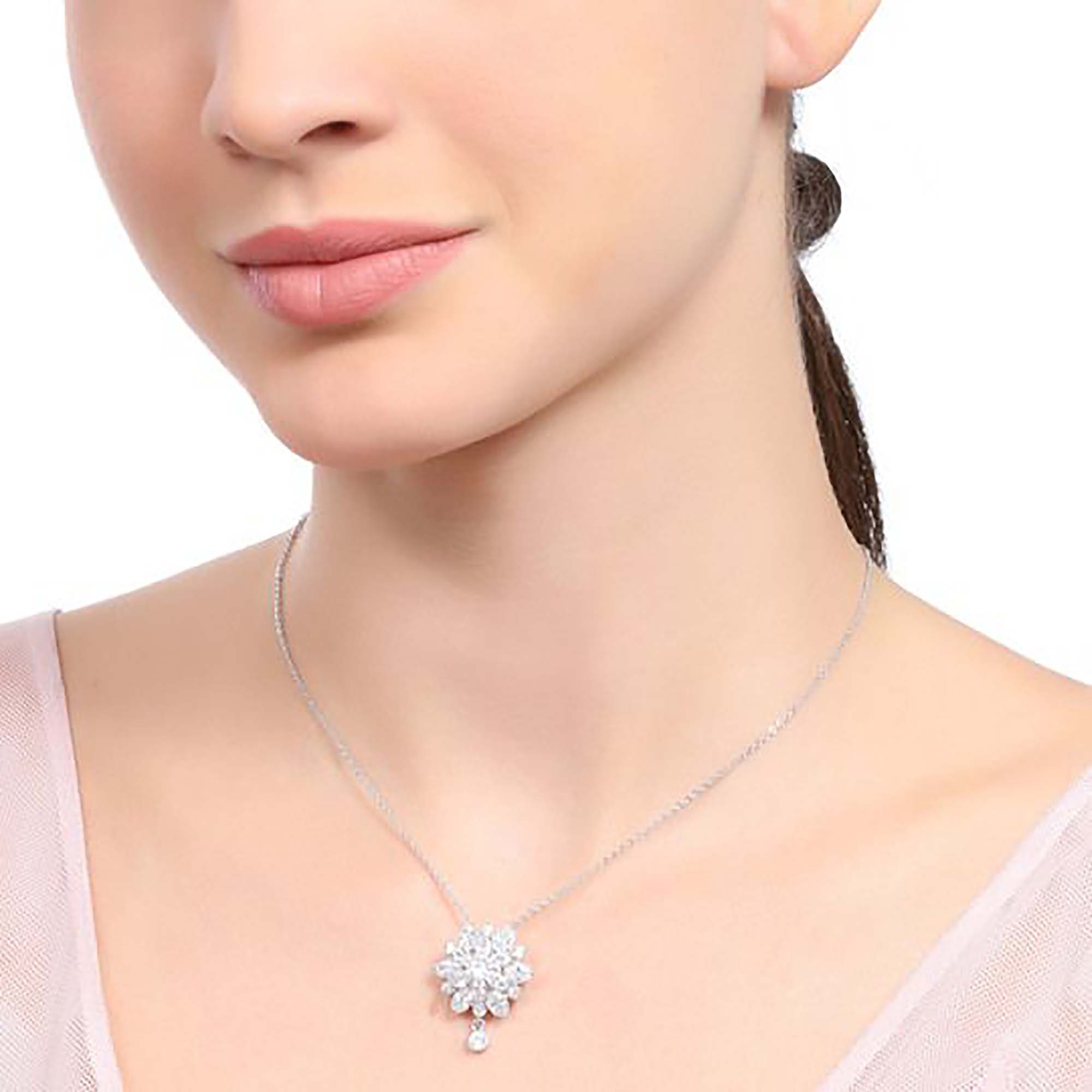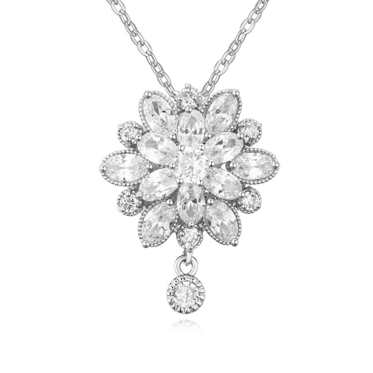 Elegante dije en baño de oro blanco de 18 quilates, diseño de flor con incrustaciones de cristales en color blanco. Fabricado en una estructura de aleación de platino con rodio sin níquel.