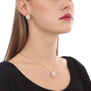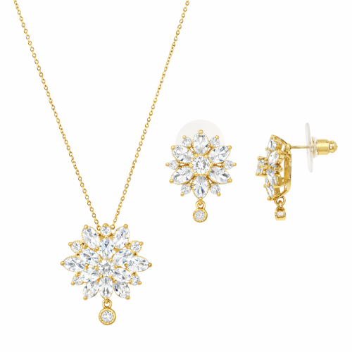 Lindo juego de aretes y dije en baño de oro amarillo de 18 quilates, diseño de flores con incrustaciones de cristales en color blanco. Fabricado en una estructura de aleación de platino con rodio sin níquel.