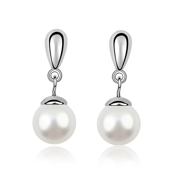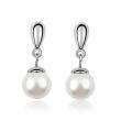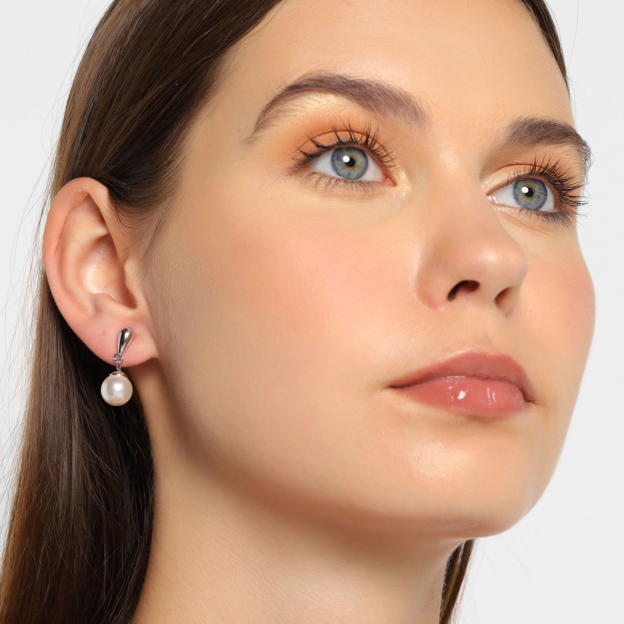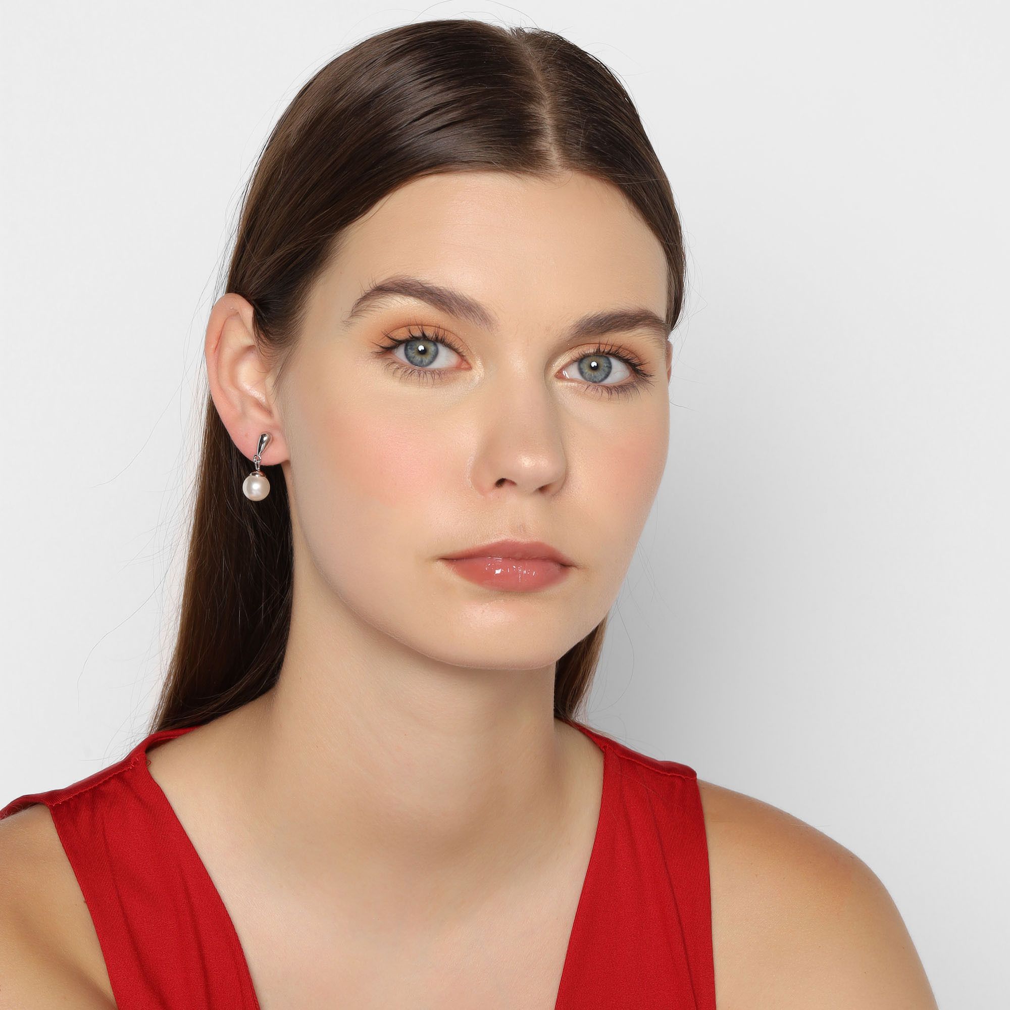 Finos aretes en baño de oro blanco de 18 quilates detalle de perla blanca. Fabricado en una estructura de aleación de platino con rodio sin níquel.