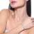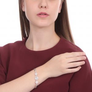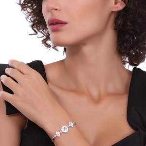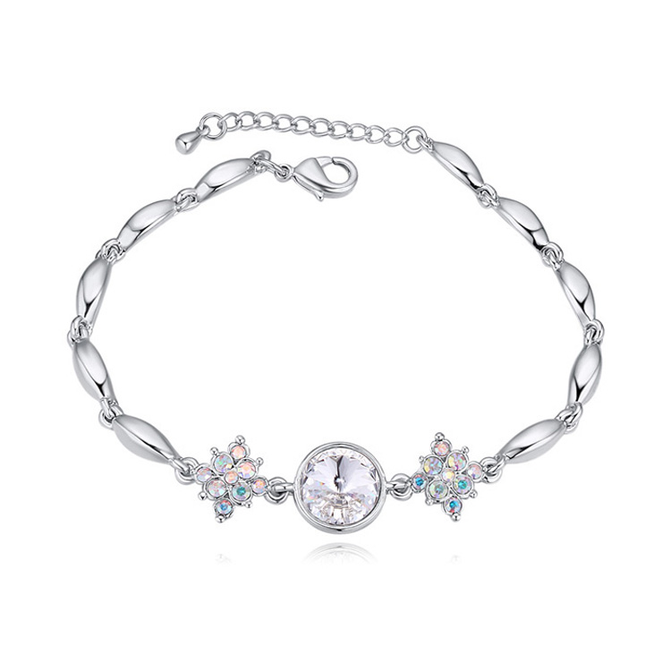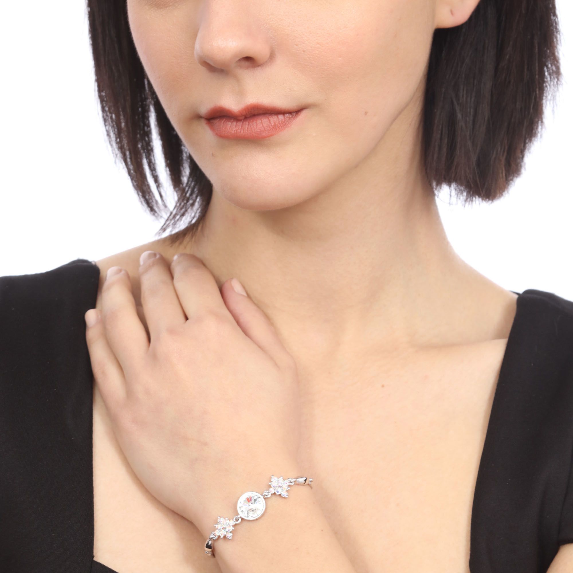 Hermosa pulsera en baño de oro blanco de 18 quilates, diseño de flores con incrustaciones de cristales tornasol y cristal corte brillante en color blanco. Fabricado en una estructura de aleación de platino con rodio sin níquel.