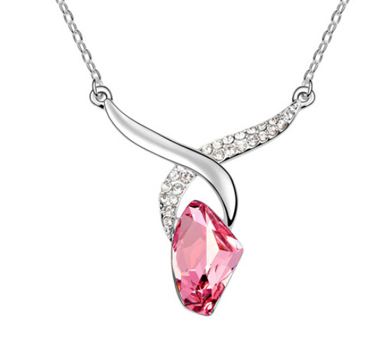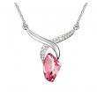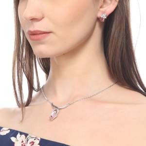 Precioso dije en baño de oro blanco de 18 quilates, con original diseño, cristal rosa e incrustaciones de cristales en color blanco. Fabricado en una estructura de aleación de platino con rodio sin níquel.
