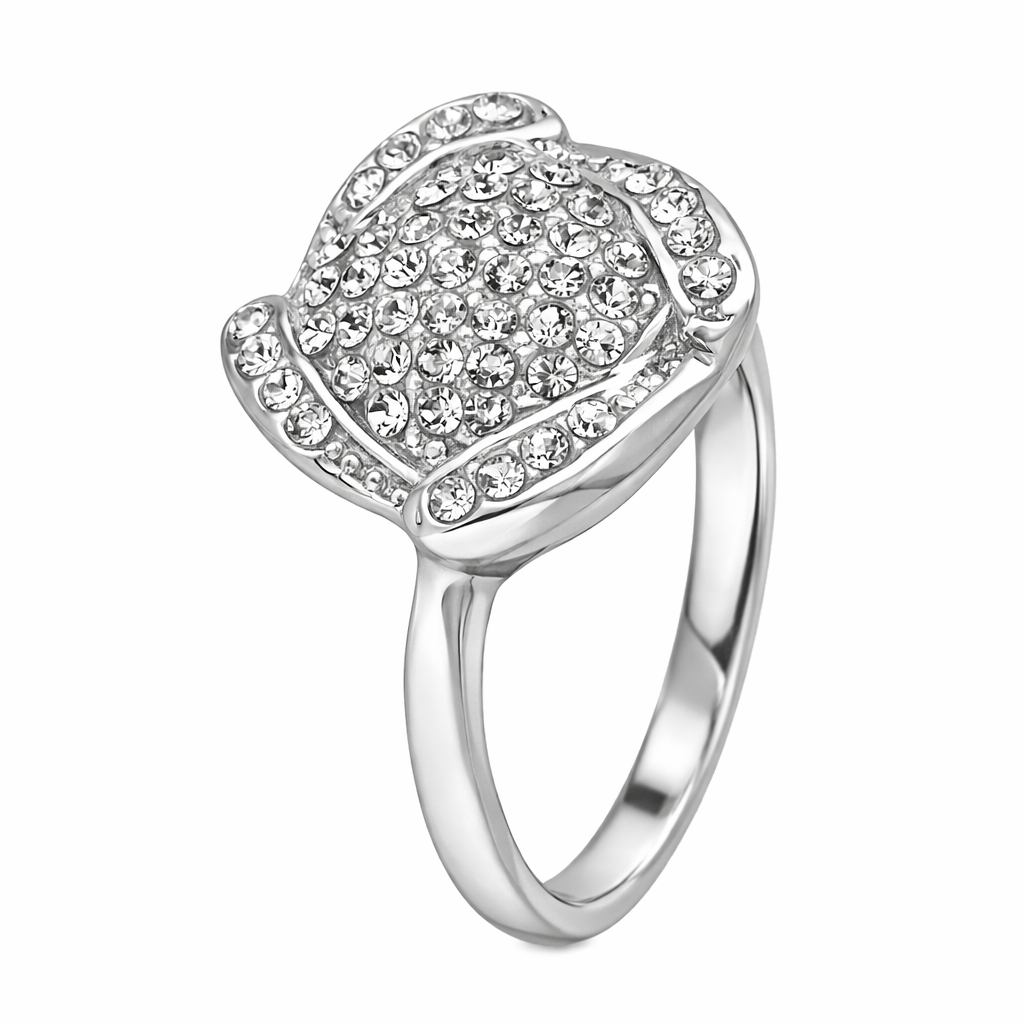 Elegante anillo en baño de oro blanco de 18 quilates, con diseño de rombo con detalles en plateado e incrustaciones de delicados cristales blancos. Fabricado en una estructura de aleación de platino con rodio sin níquel.