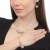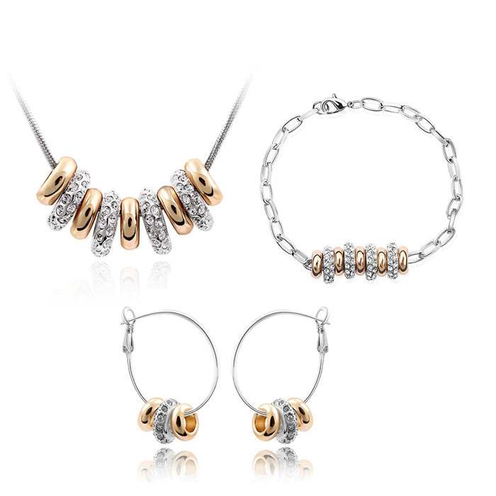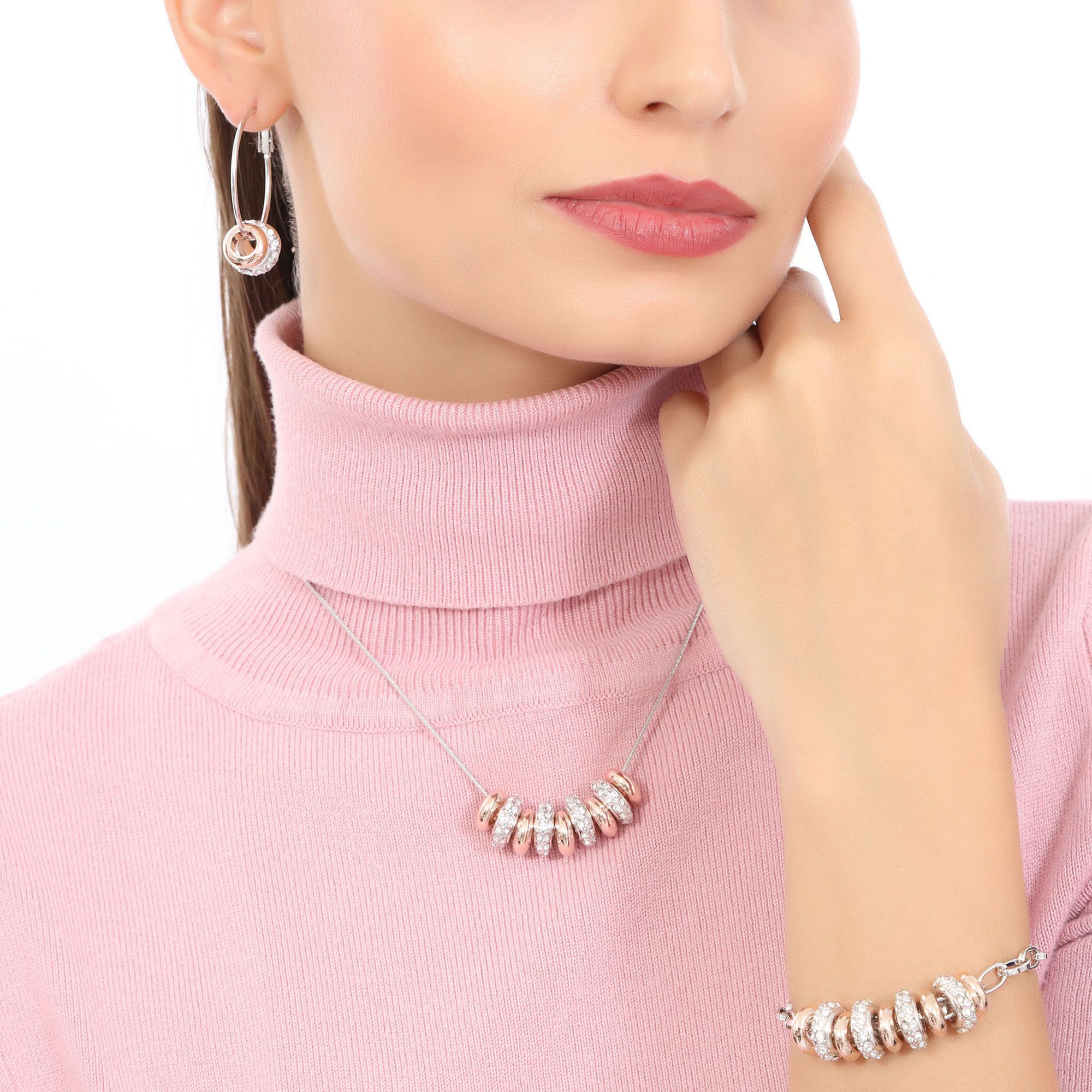 Juego de aretes, collar y pulsera en baño de oro blanco y rosa de 18 quilates, fino diseño de aros con incrustaciones de cristales en color blanco. Fabricado en una estructura de aleación de platino con rodio sin níquel.