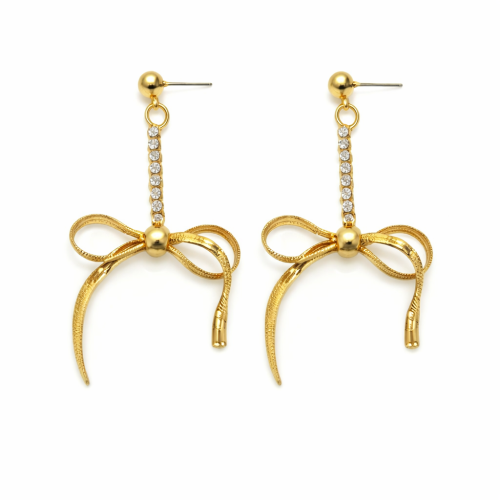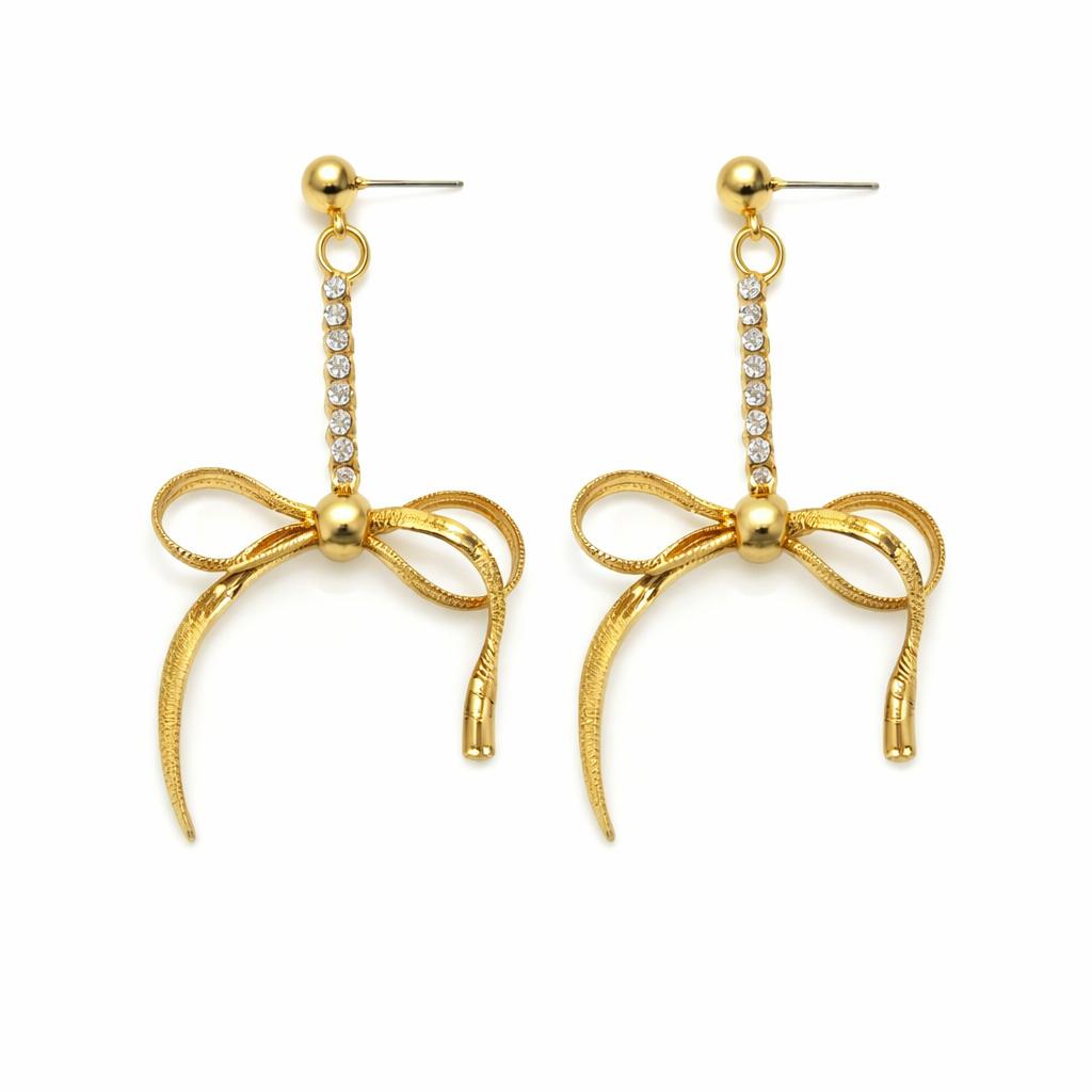 Originales aretes en baño de oro amarillo de 18 quilates con detalle de moño e incrustaciones de cristales blancos. Fabricado en una estructura de aleación de platino con rodio sin níquel.