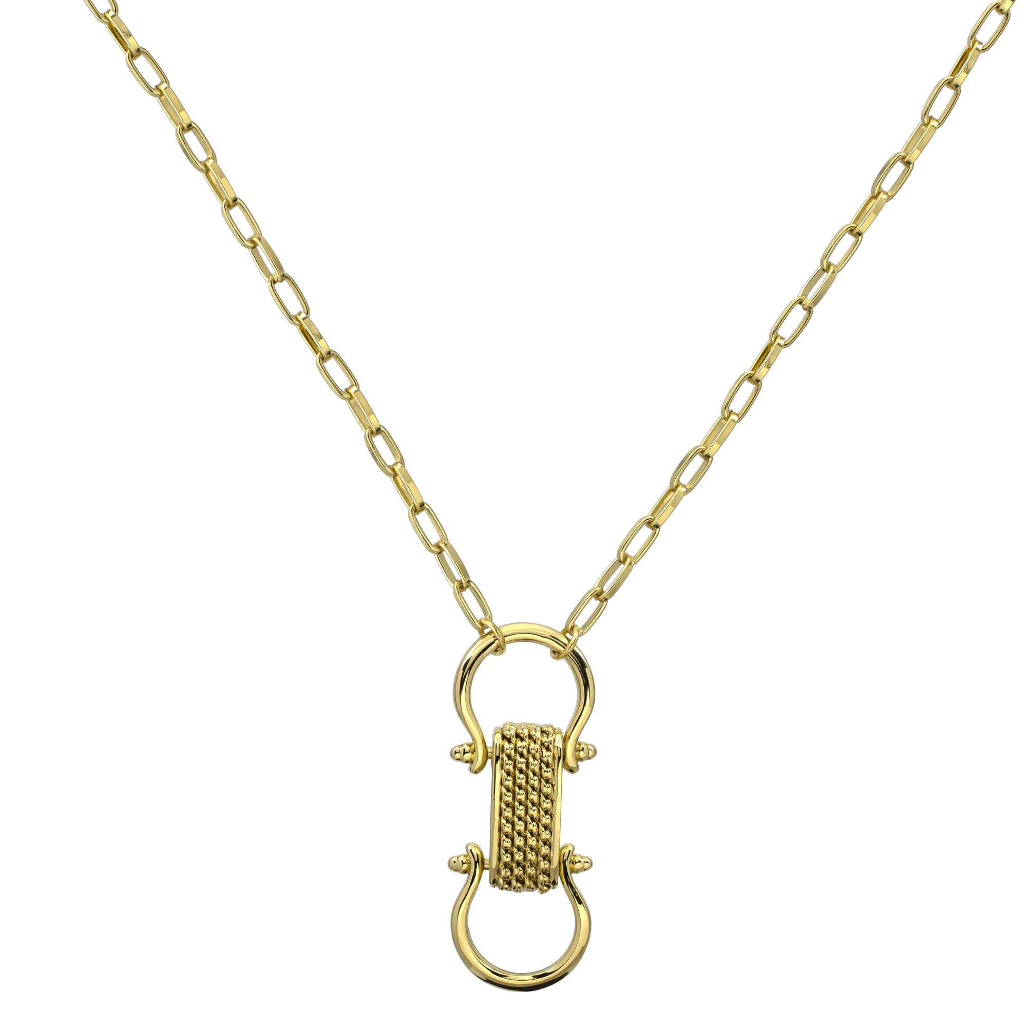 Original dije con cadena en baño de oro de amarillo de 18 quilates, diseño de hebilla estilizada e incrustaciones de cristales. La cadena es de 40 cm y tiene una extensión de 5 cm. Fabricado en una estructura de aleación de platino con rodio sin níquel.