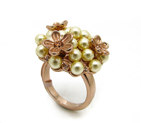 Delicado anillo, en baño de oro rosa de 18 quilates, con pequeñas perlas ivory, flores rosadas e incrustaciones de cristales blancos. Fabricado en una estructura de aleación de platino con rodio sin níquel.