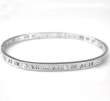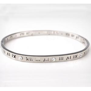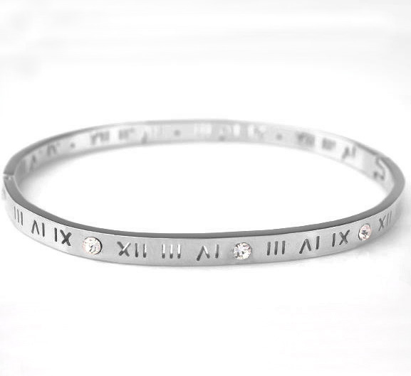 Hermoso brazalete de acero inoxidable color blanco, diseño grabado de número romanos con incrustaciones de cristales en color blanco.