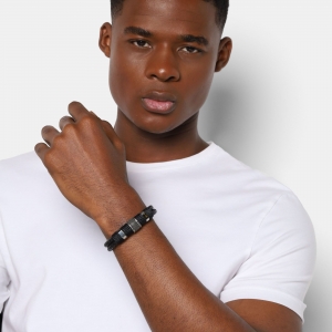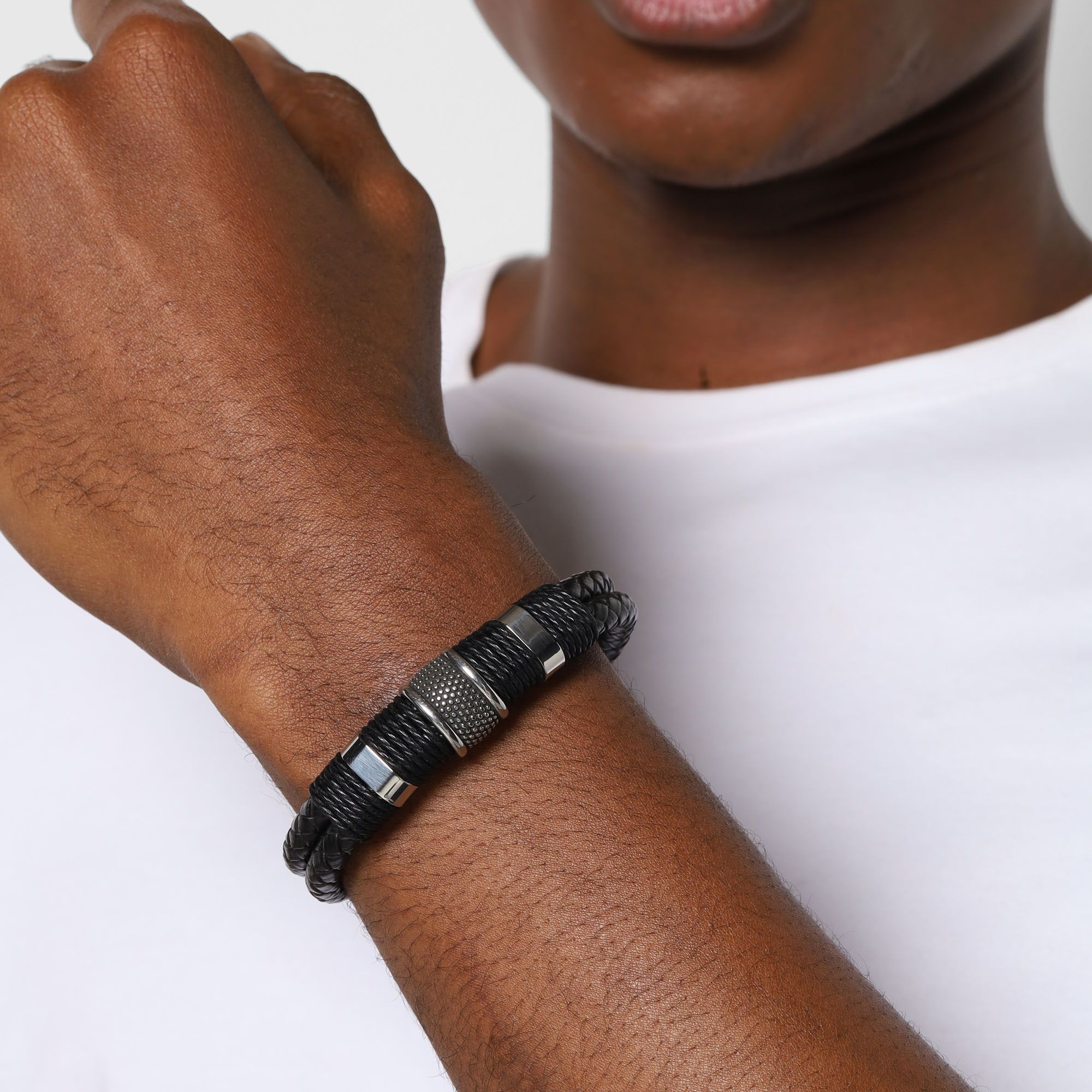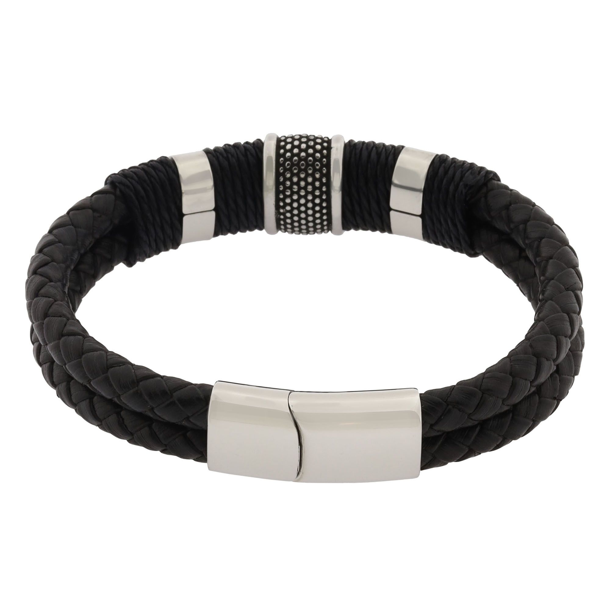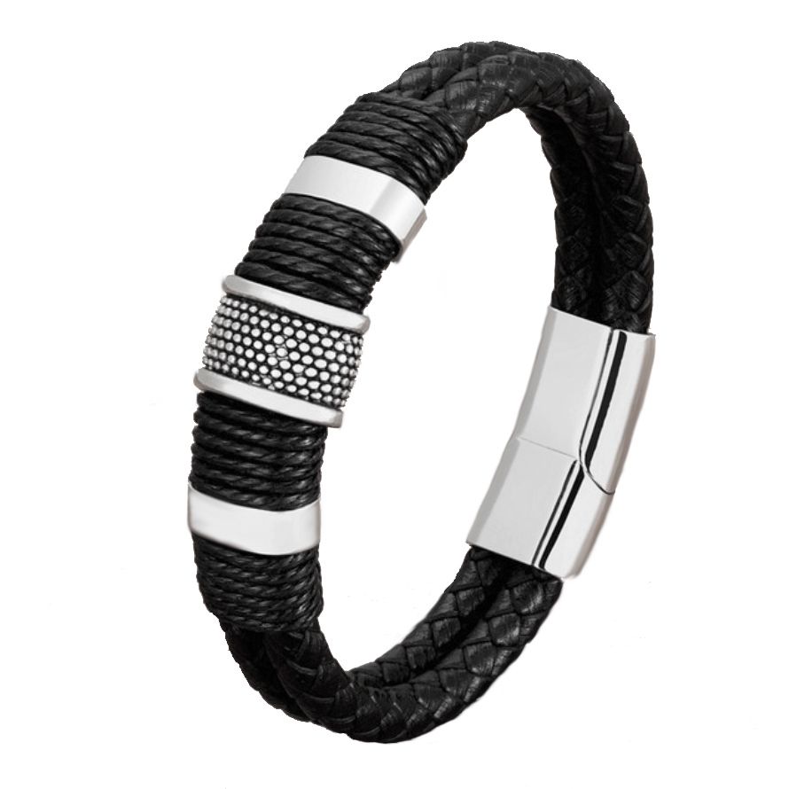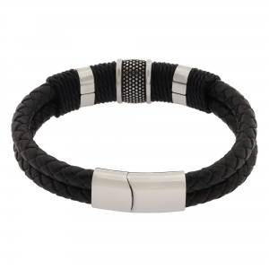 Pulsera de cuero en color negro, diseño doble con textura trenzada y detalles en acero inoxidable.