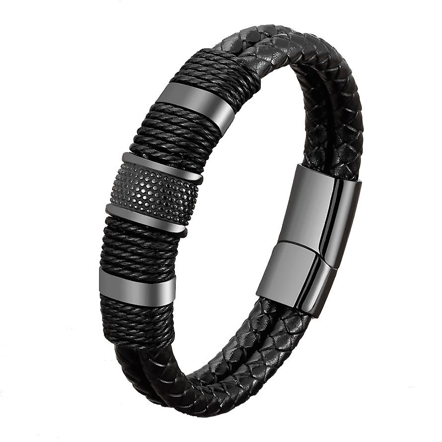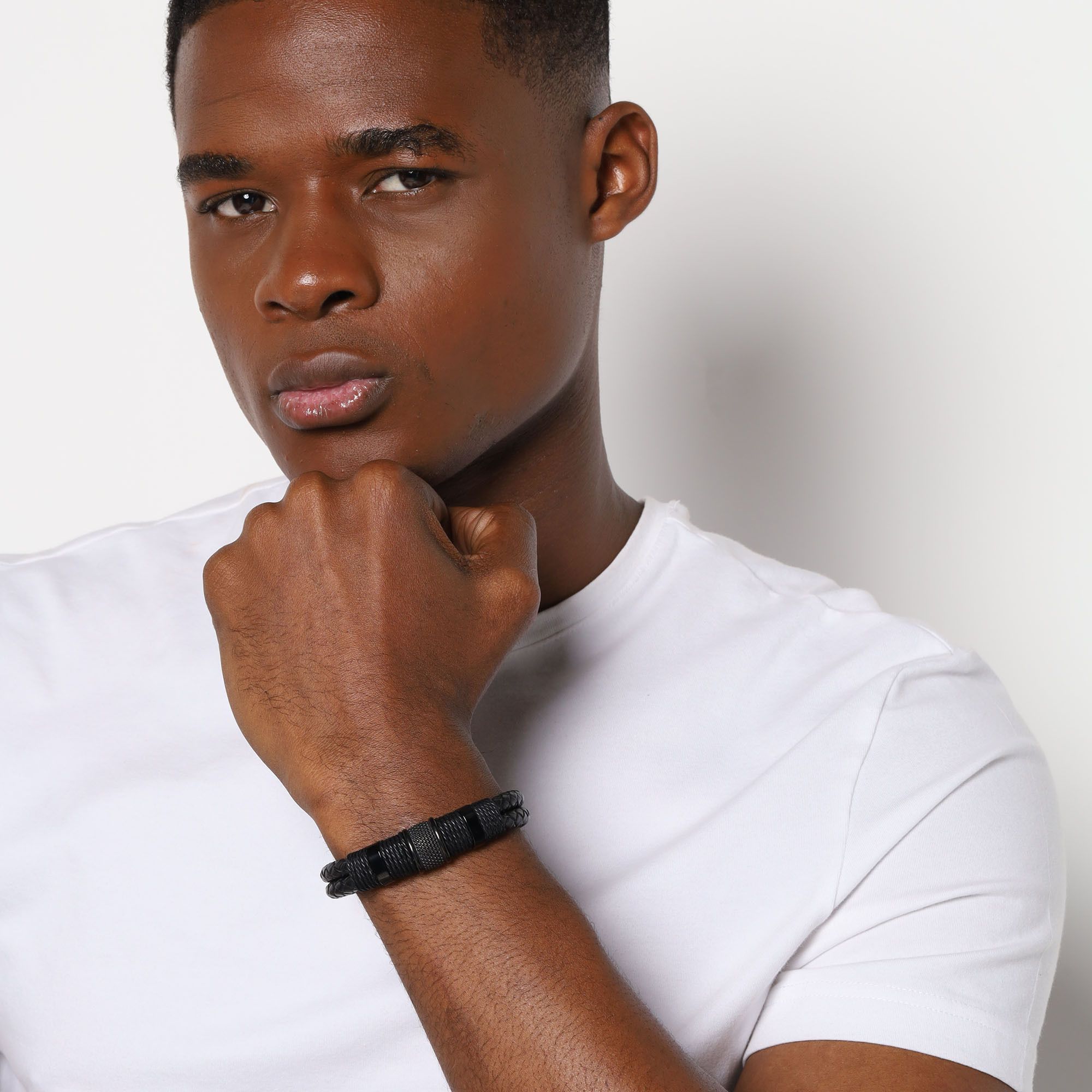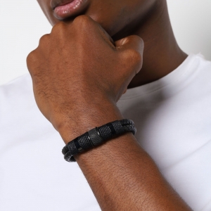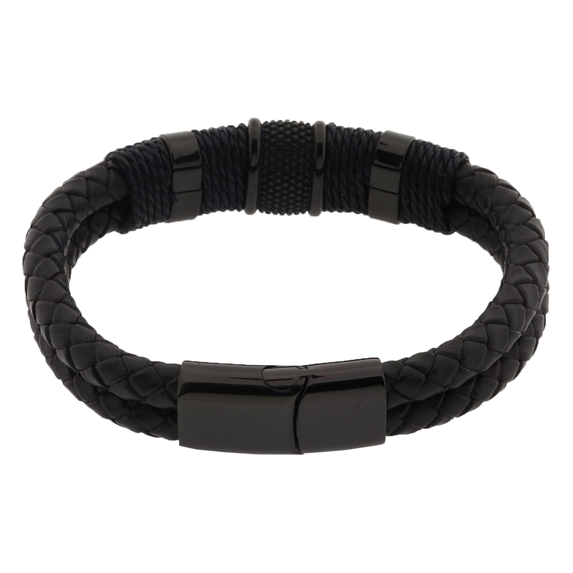 Pulsera de cuero en color negro, diseño doble con textura trenzada y detalles en acero inoxidable color negro.