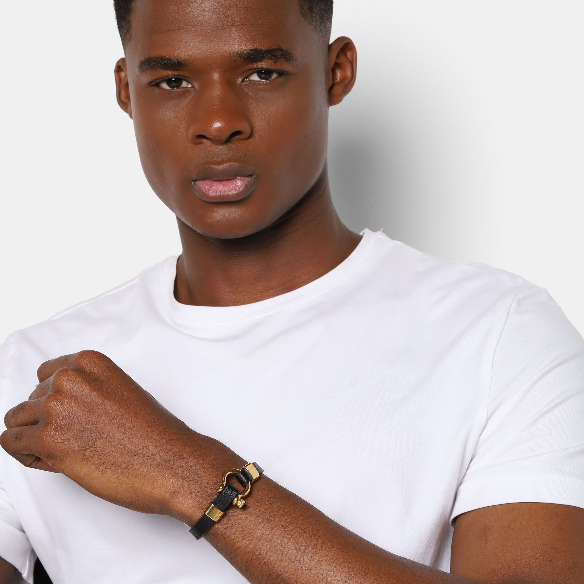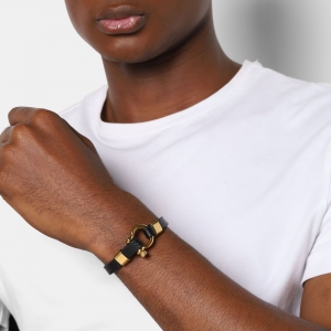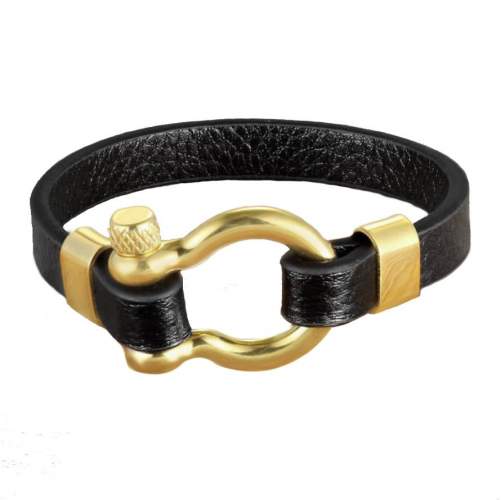 Pulsera de cuero en color negro, con detalles y broche de tornillo en acero inoxidable color amarillo.