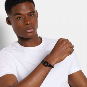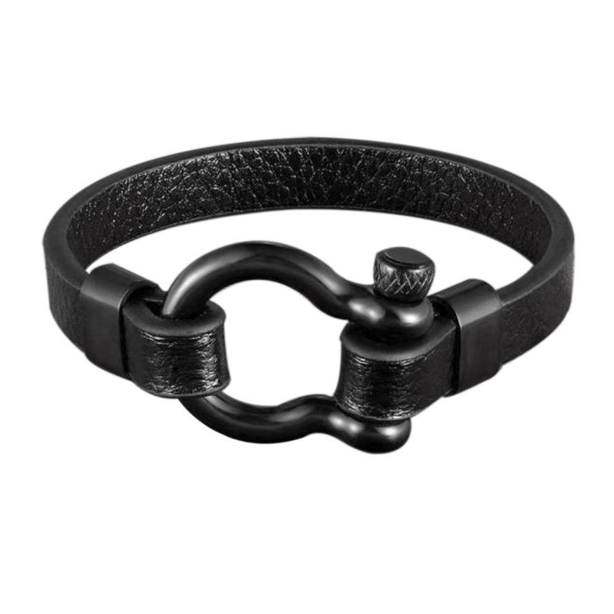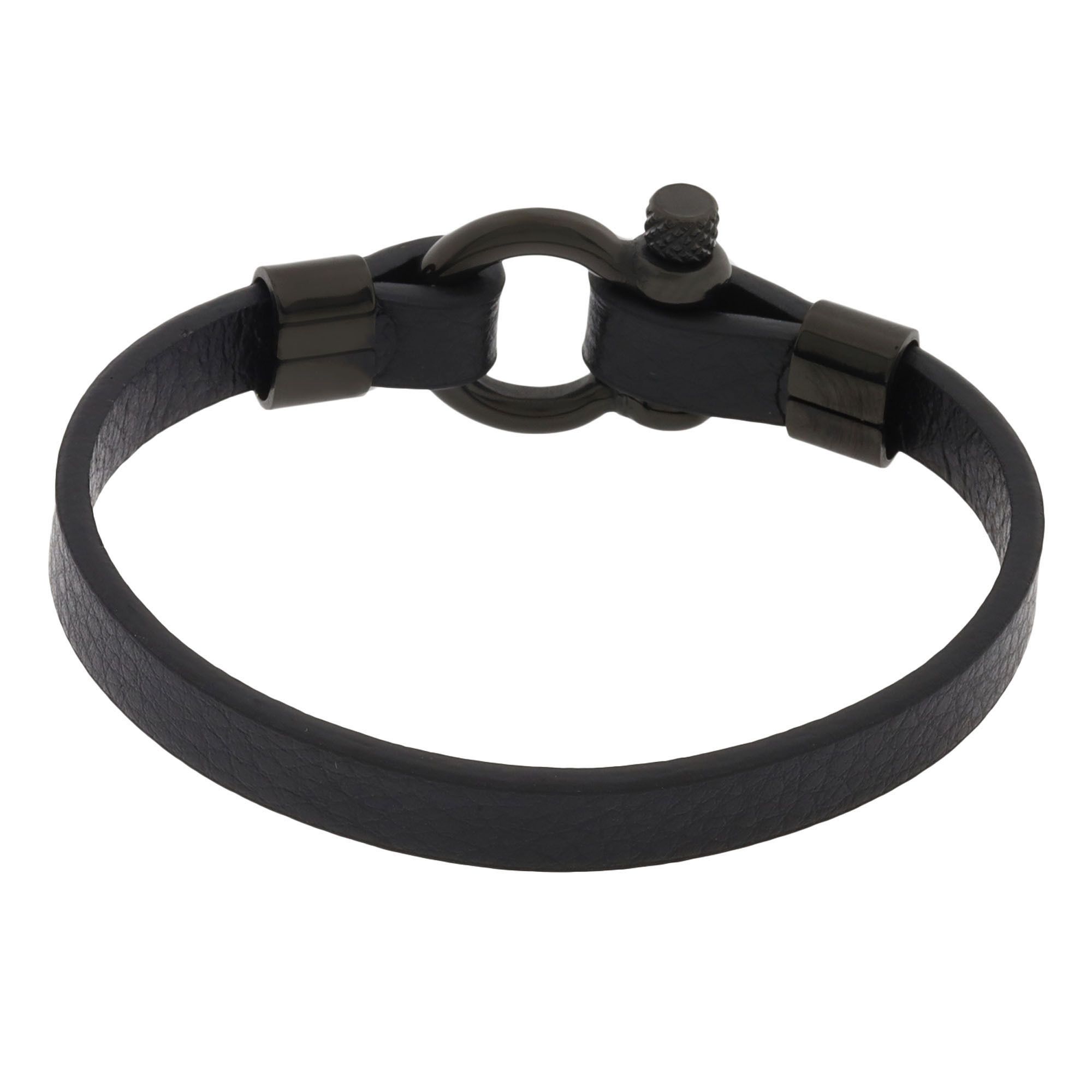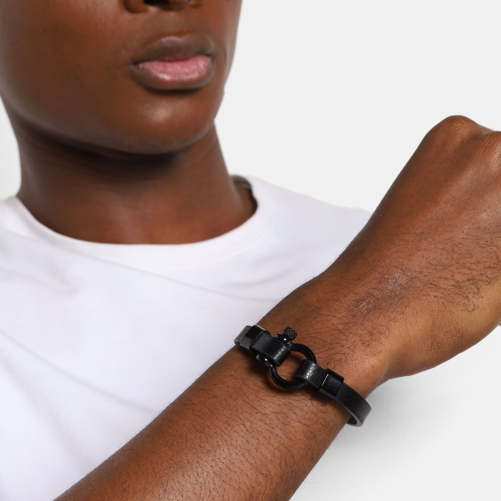 Pulsera de cuero en color negro, con detalles y broche de tornillo en acero inoxidable color negro.