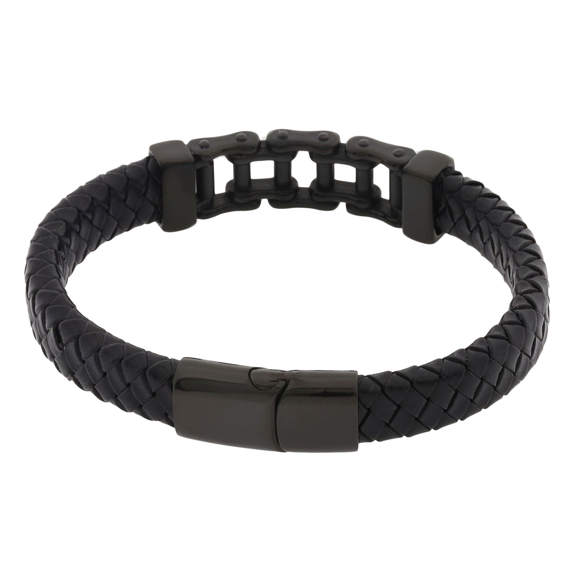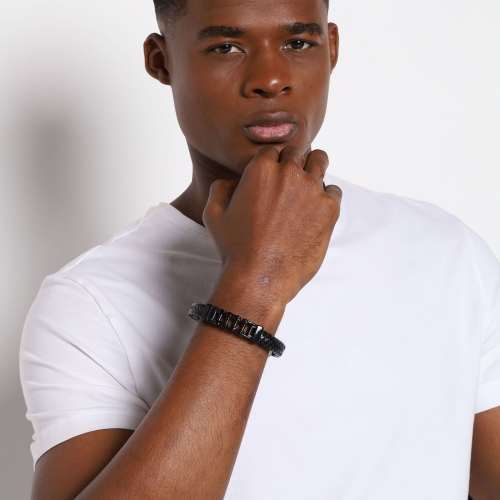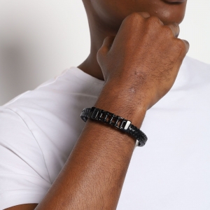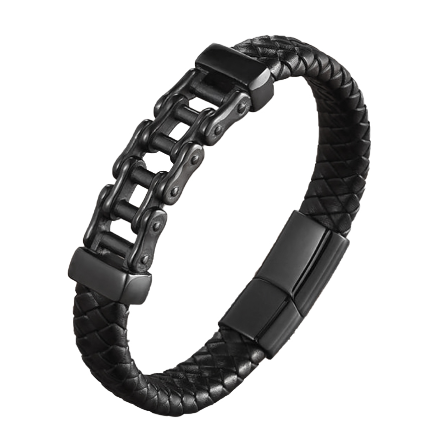 Pulsera de cuero trenzada en color negro, detalle de cadena de transmisión y broche en acero inoxidable en color negro. 1. Joyería hipoalergénica. 2. Incluye cajita de joyería. 3. Garantía de 30 días por defectos de fabrica. |