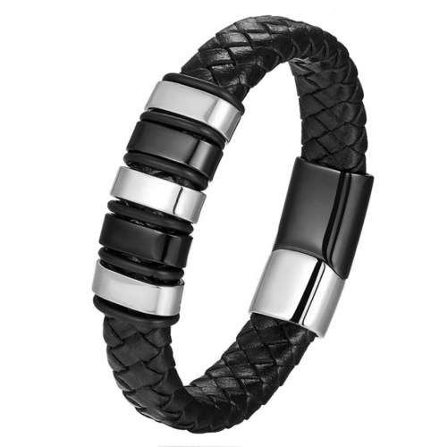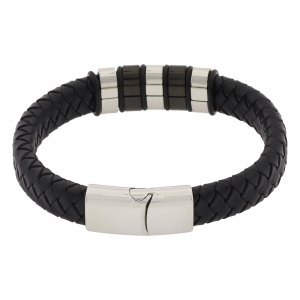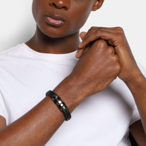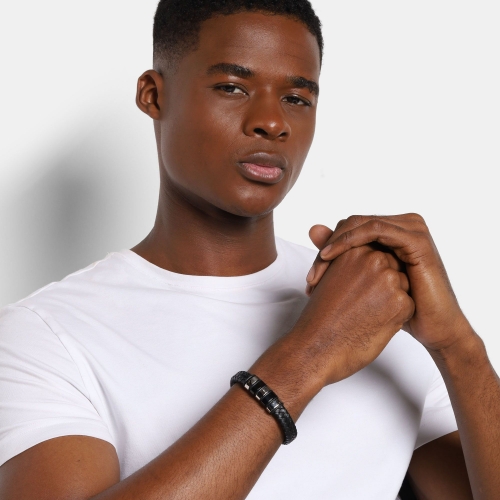 Pulsera de cuero trenzada en color negro, detalles y broche en acero inoxidable en color negro y acero.