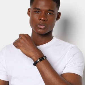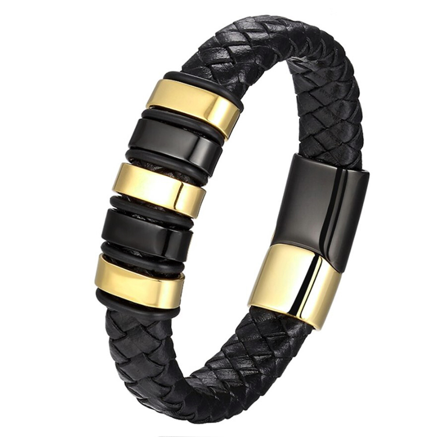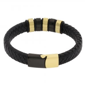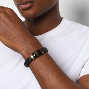 Pulsera de cuero trenzada en color negro, detalles y broche en acero inoxidable en color negro y amarillo.