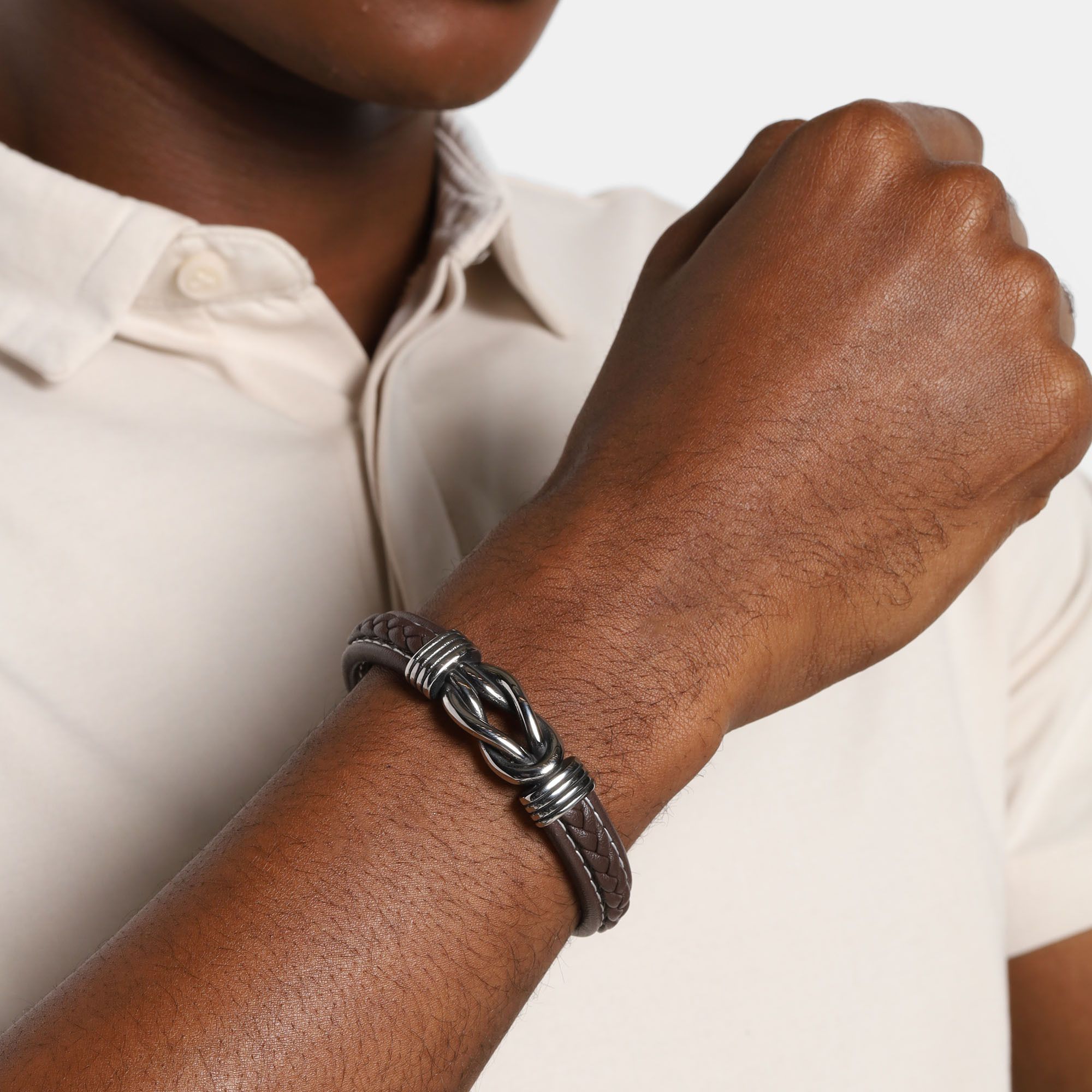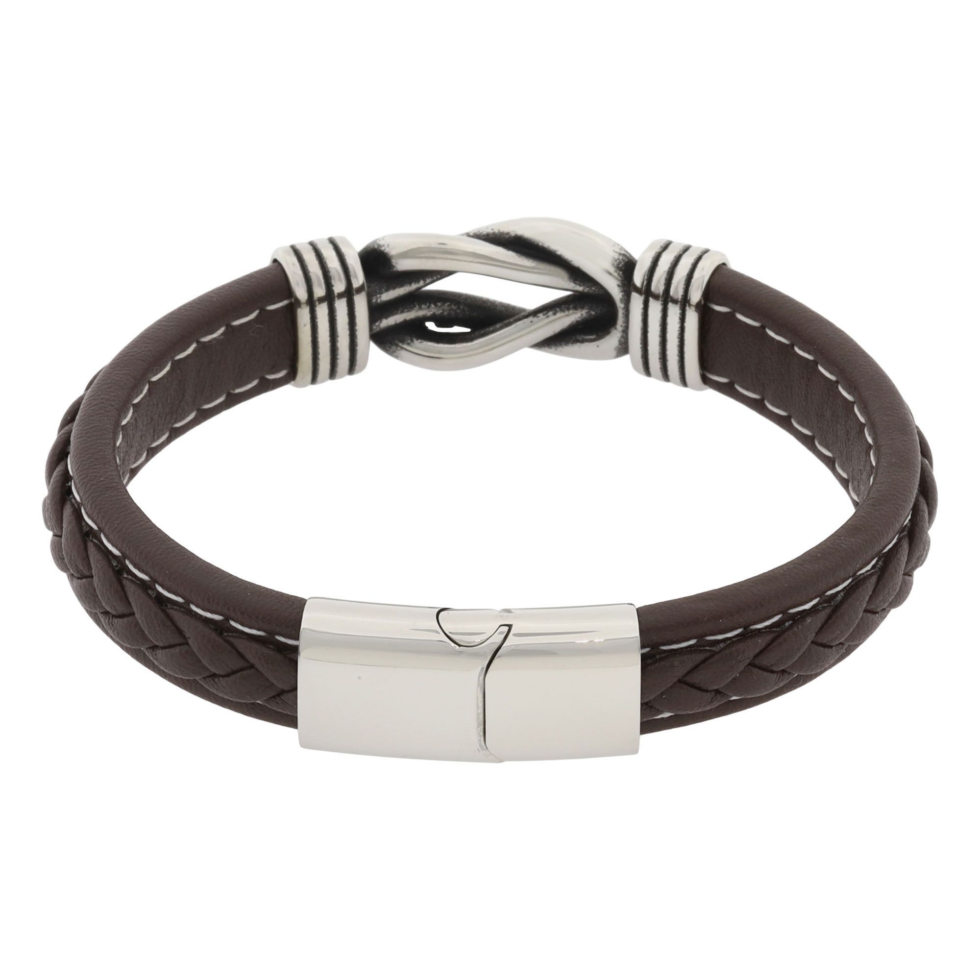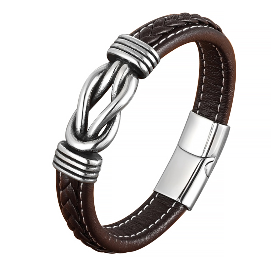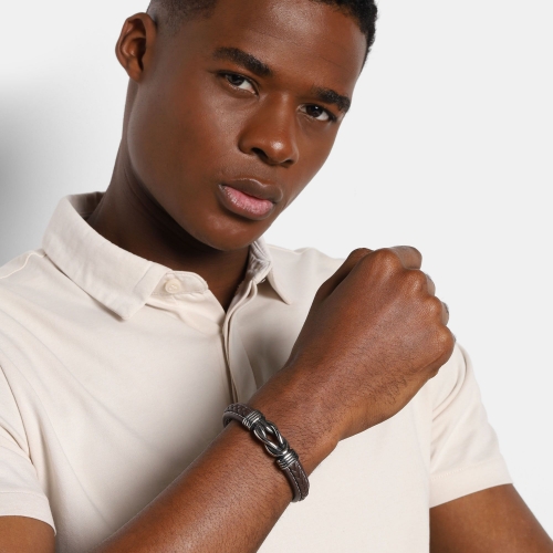 Pulsera de cuero en color café, diseño trenzado con detalles en forma de nudo y broche en acero inoxidable.