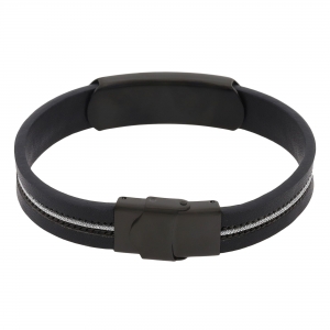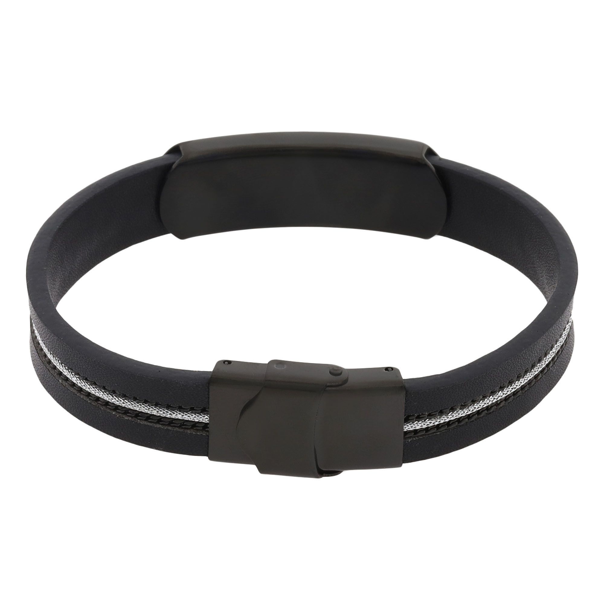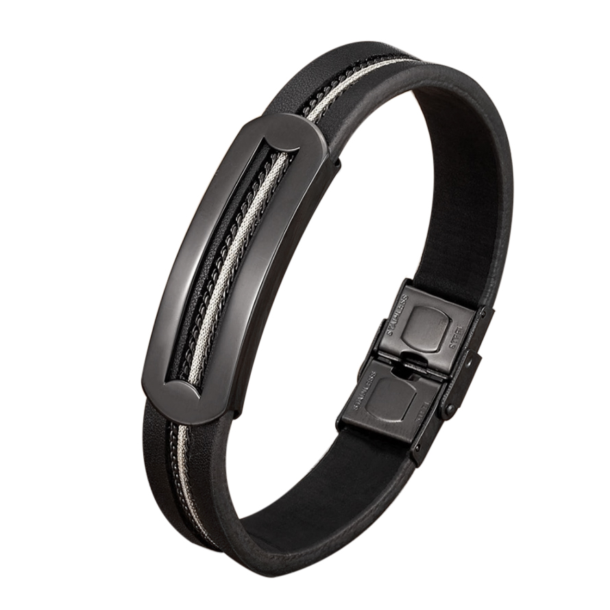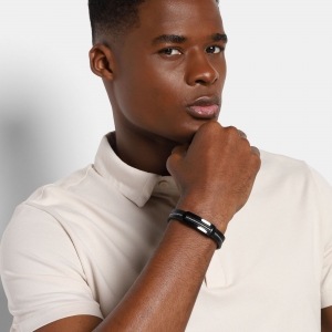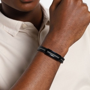 Pulsera de cuero en color negro, con detalles en tela y en acero inoxidable color negro.