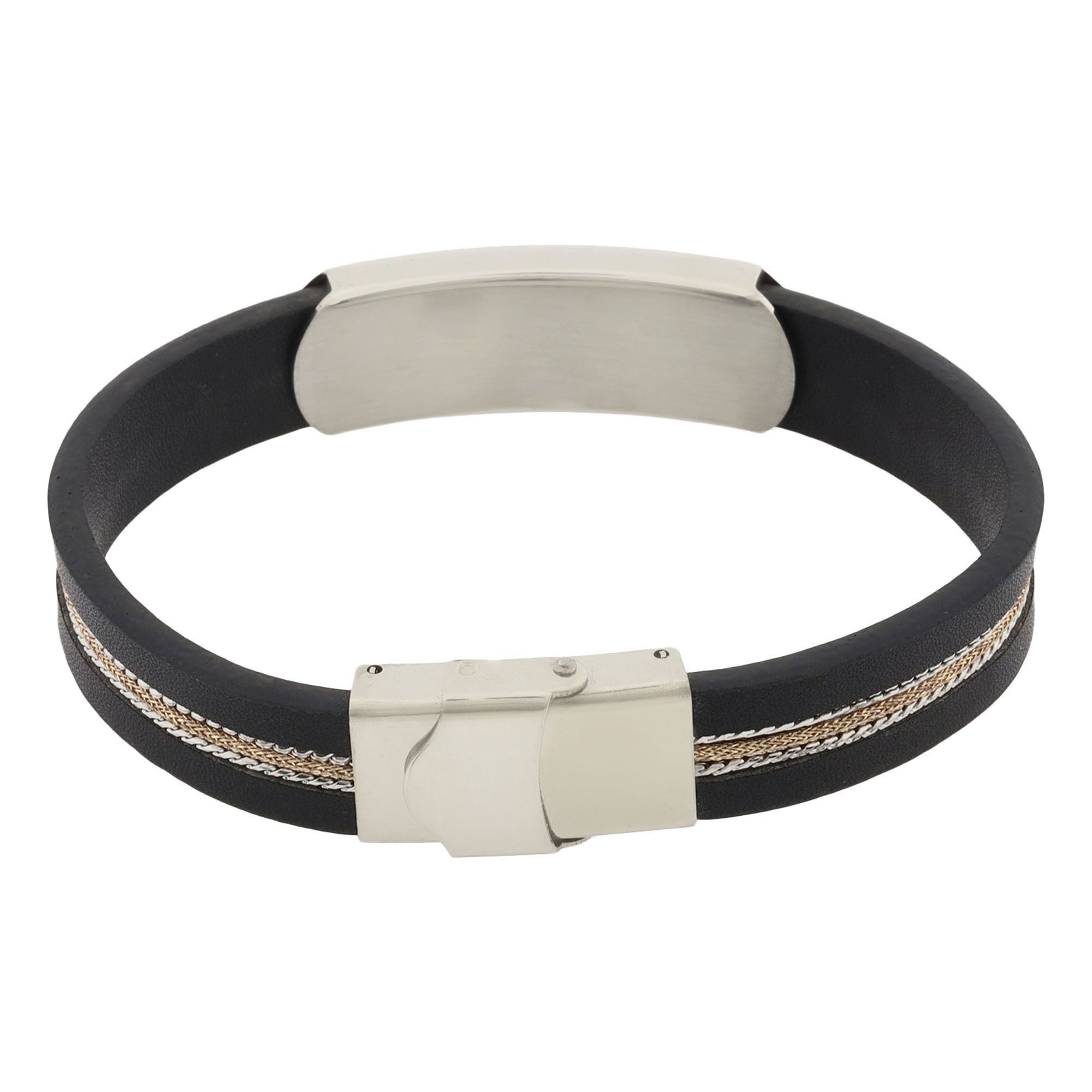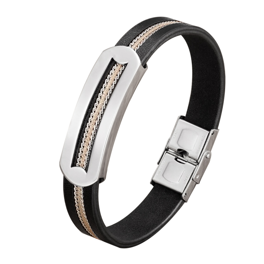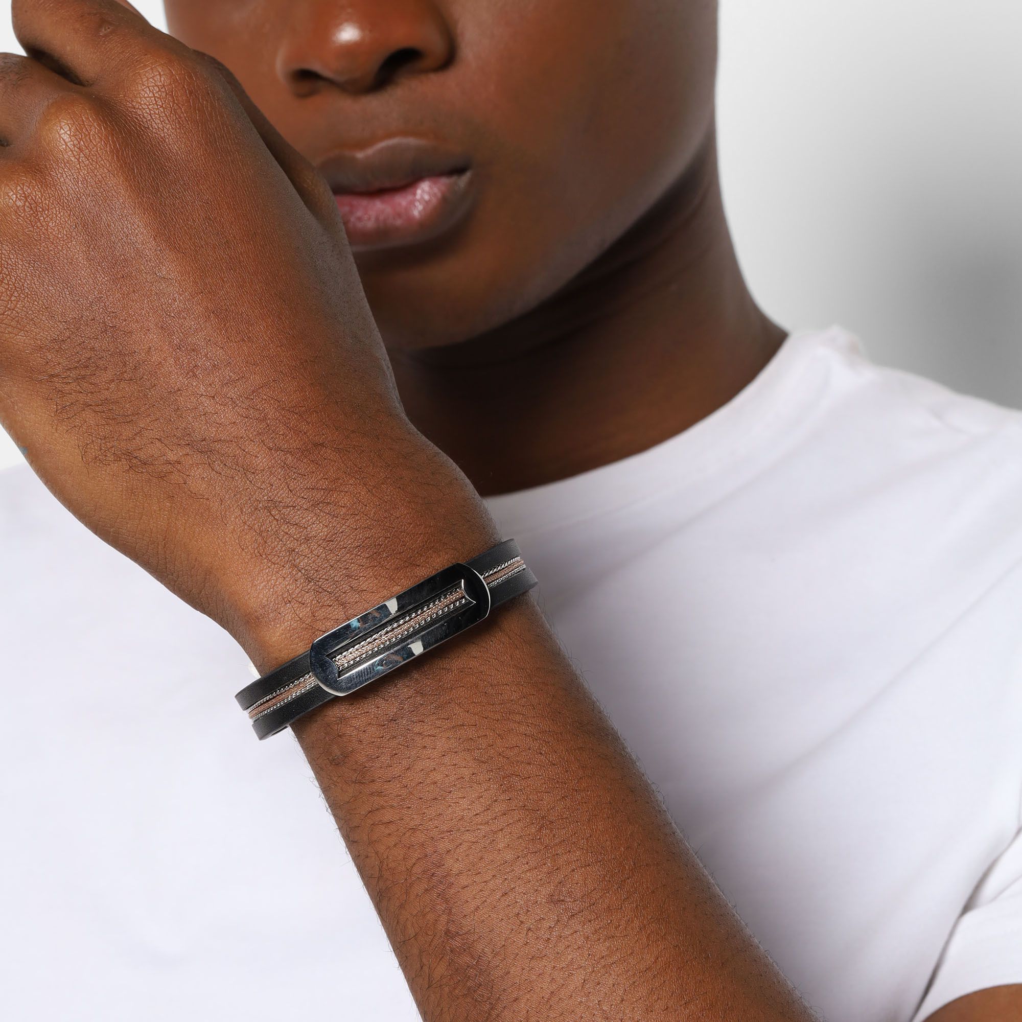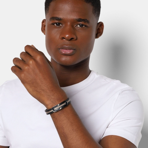 Pulsera de cuero en color negro, con detalles en tela y en acero inoxidable color blanco.