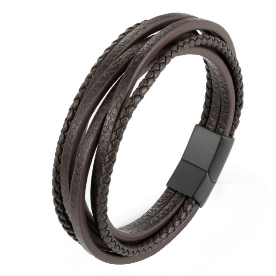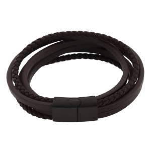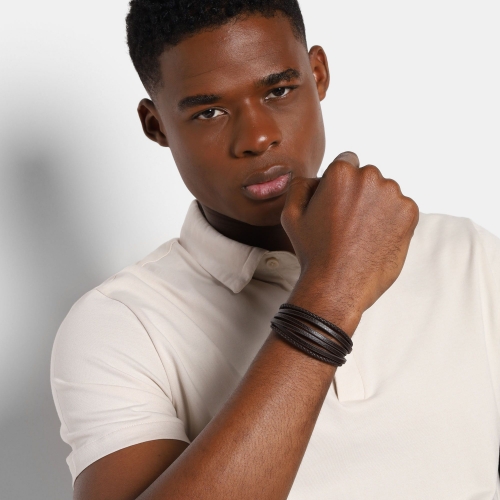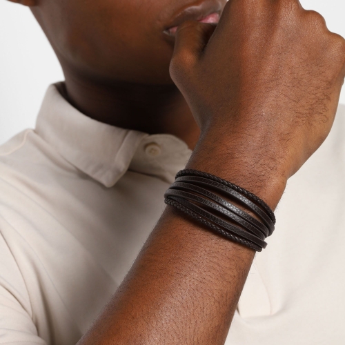 Pulsera de cuero color café, diseño de tiras con broche en acero inoxidable en color negro.