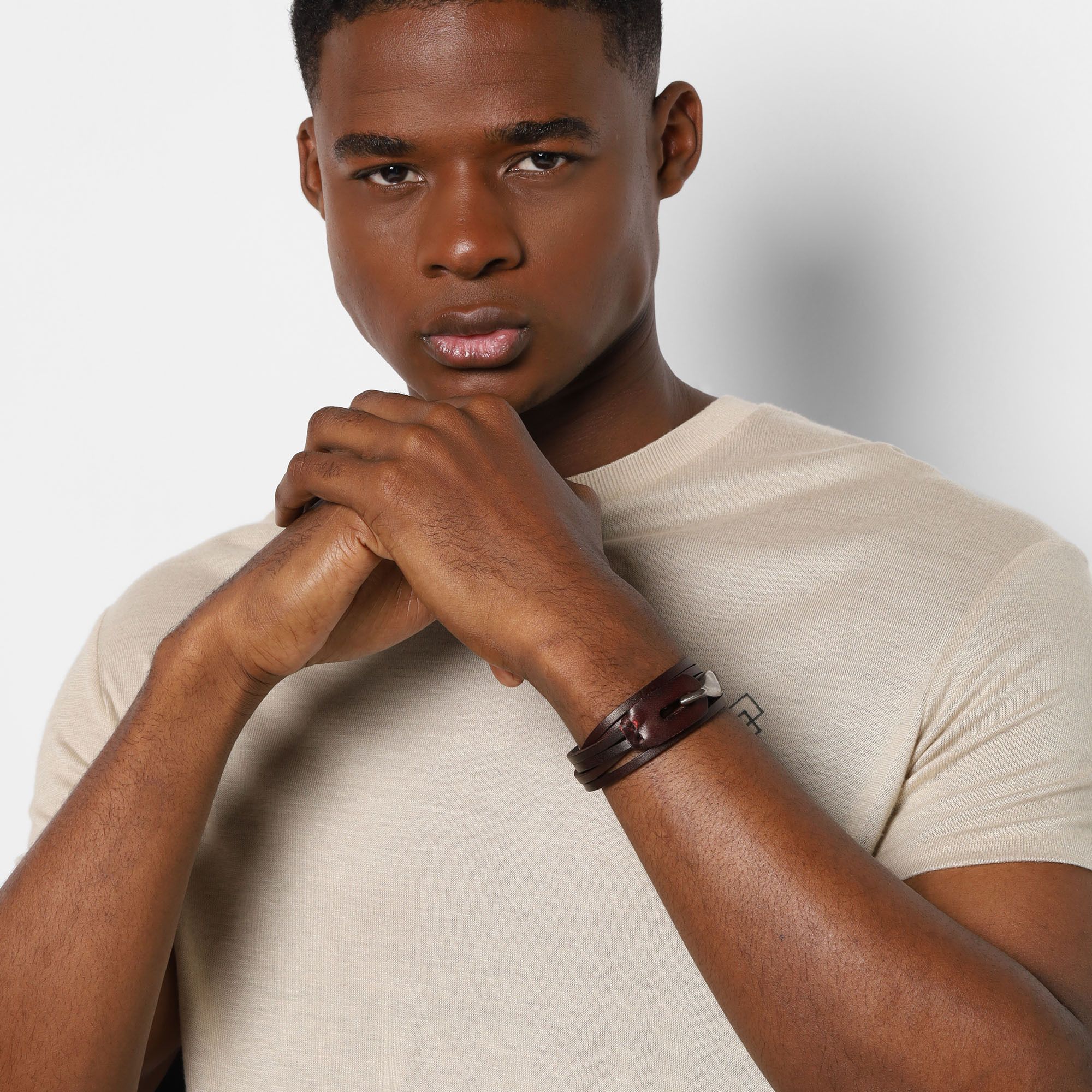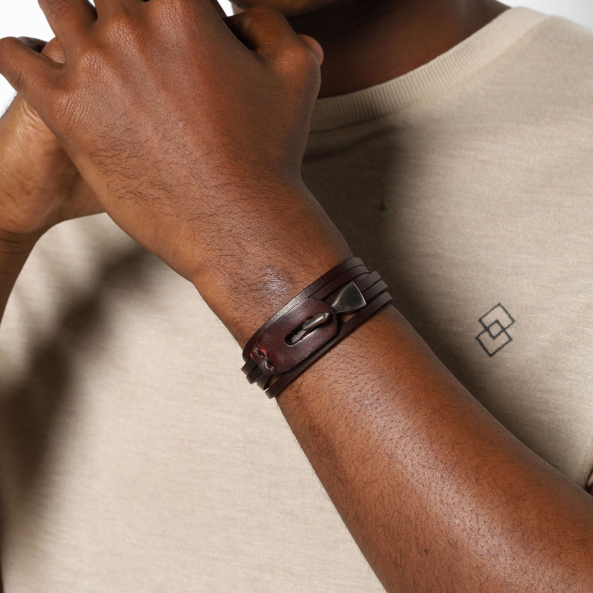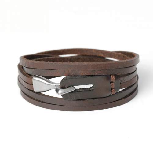 Pulsera de cuero color café, diseño de tiras con detalle de broche de gancho en acero inoxidable color blanco.
