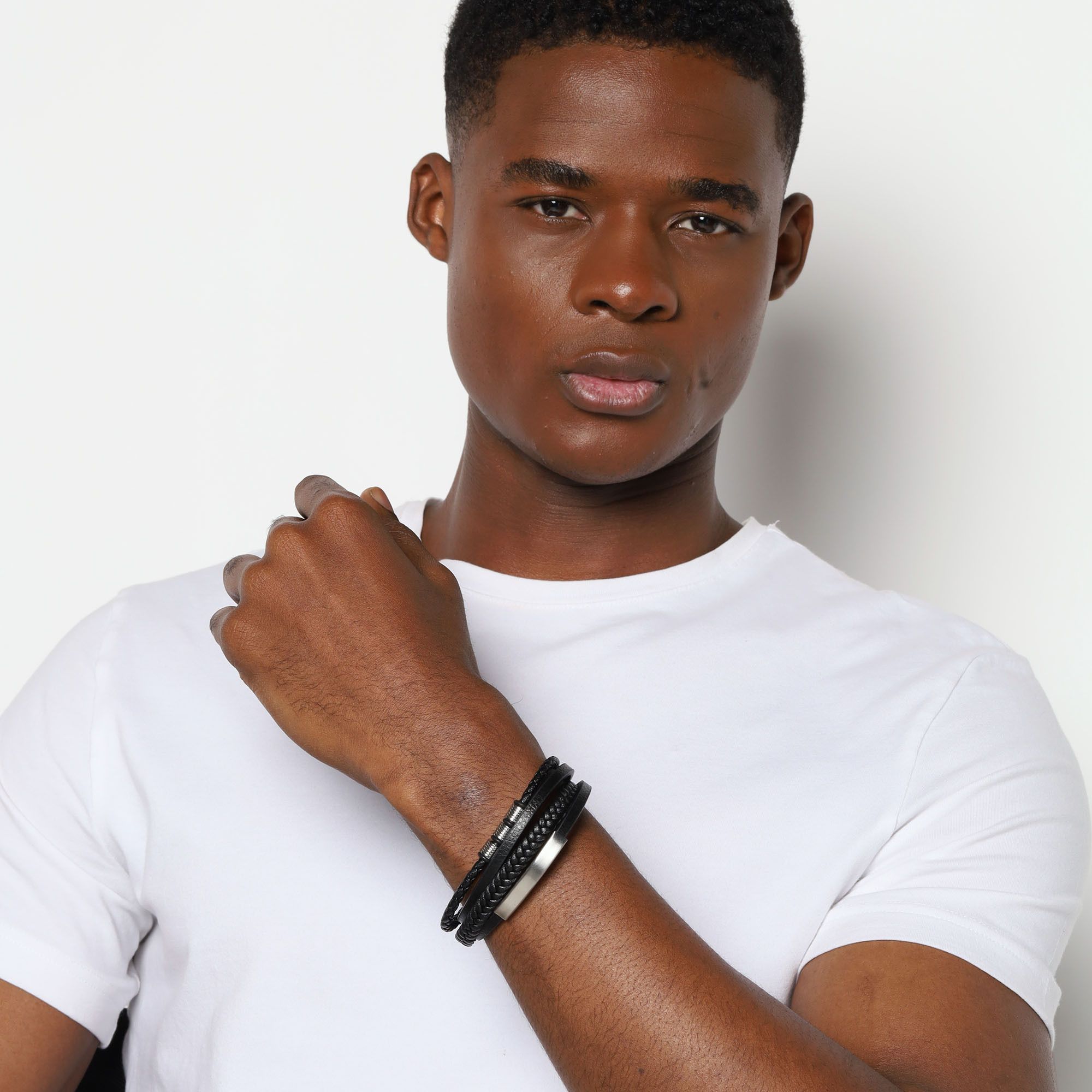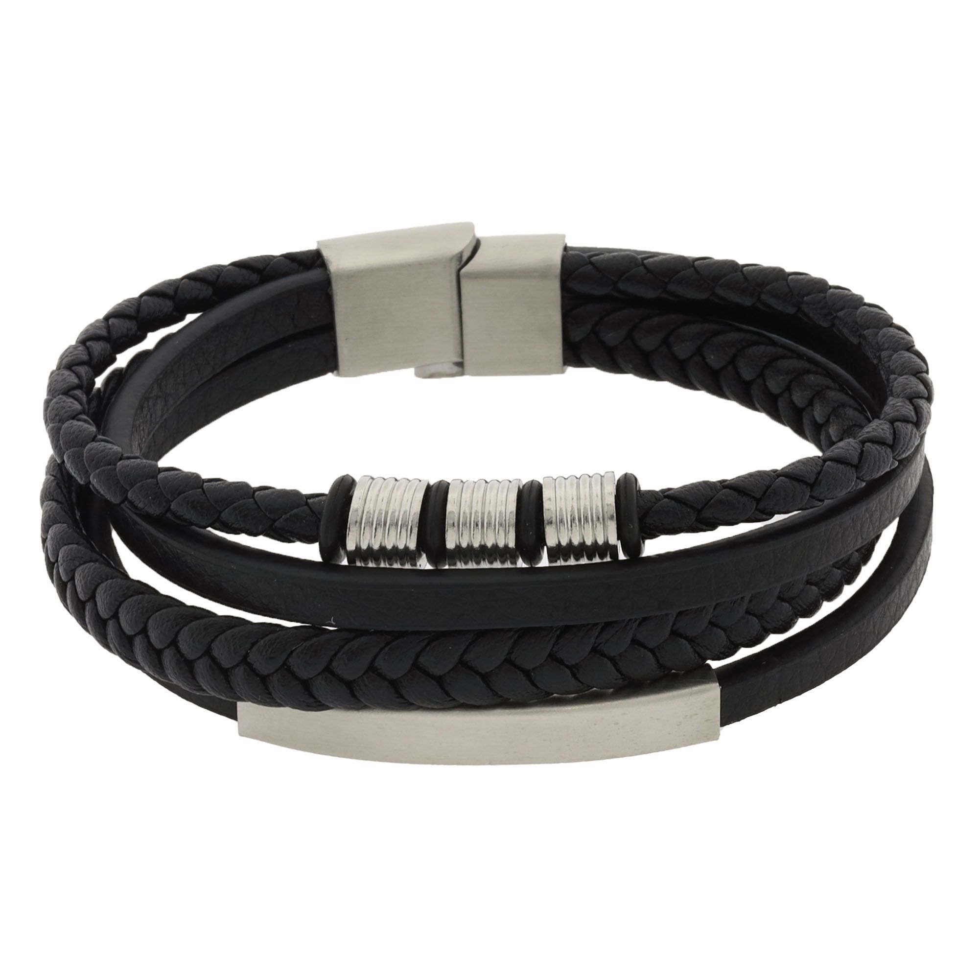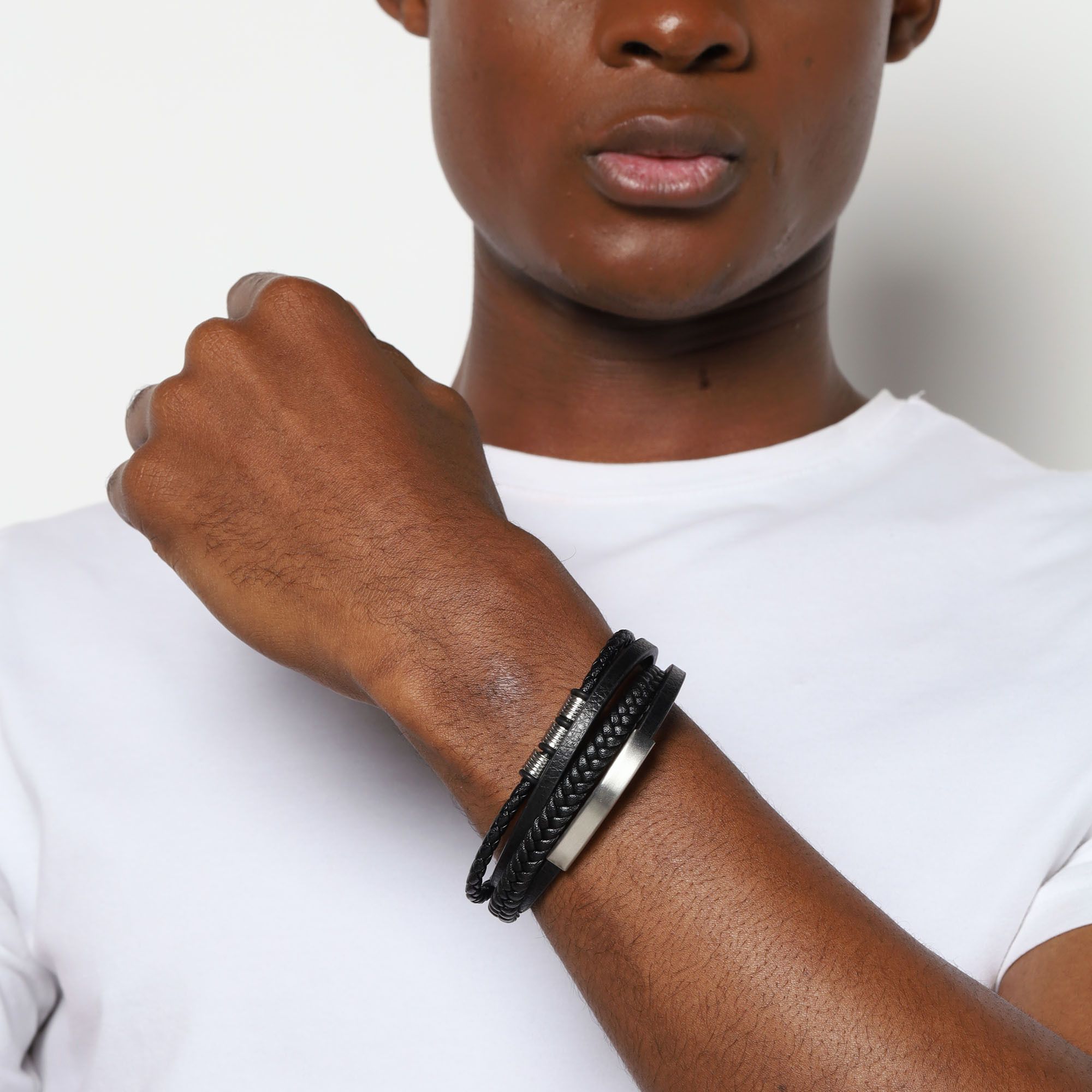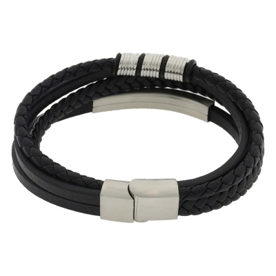 Pulsera de cuero en color negro, diseño de tiras trenzadas y detalles de acero inoxidable en color blanco.