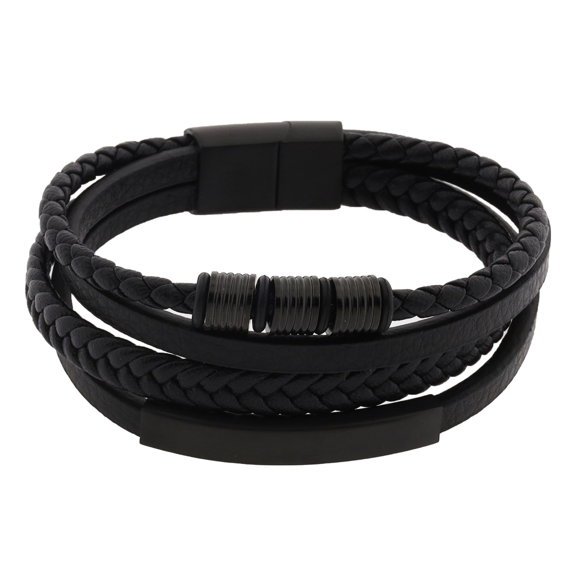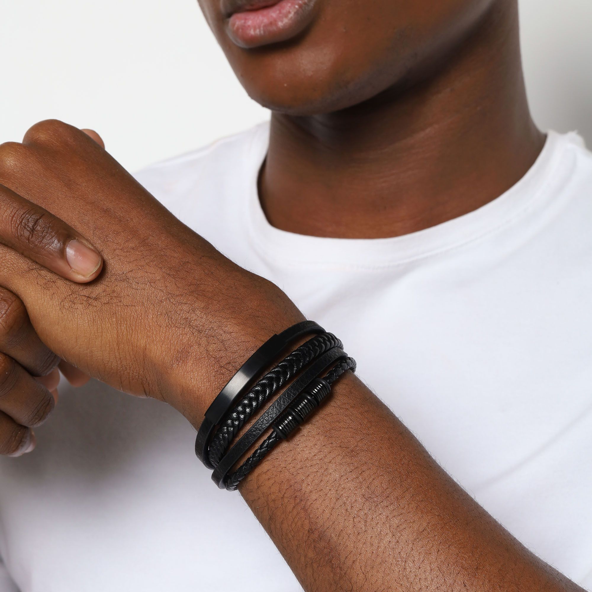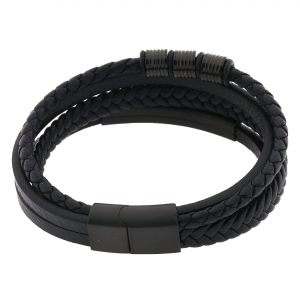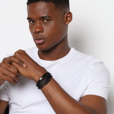 Pulsera de cuero en color negro, diseño de tiras trenzadas y detalles de acero inoxidable en color negro.