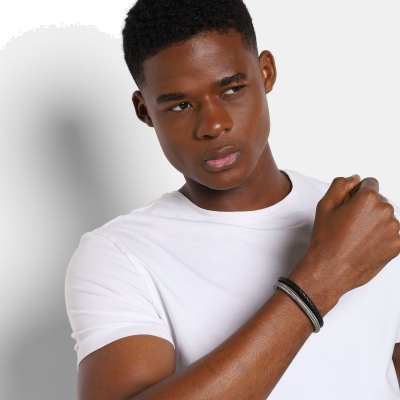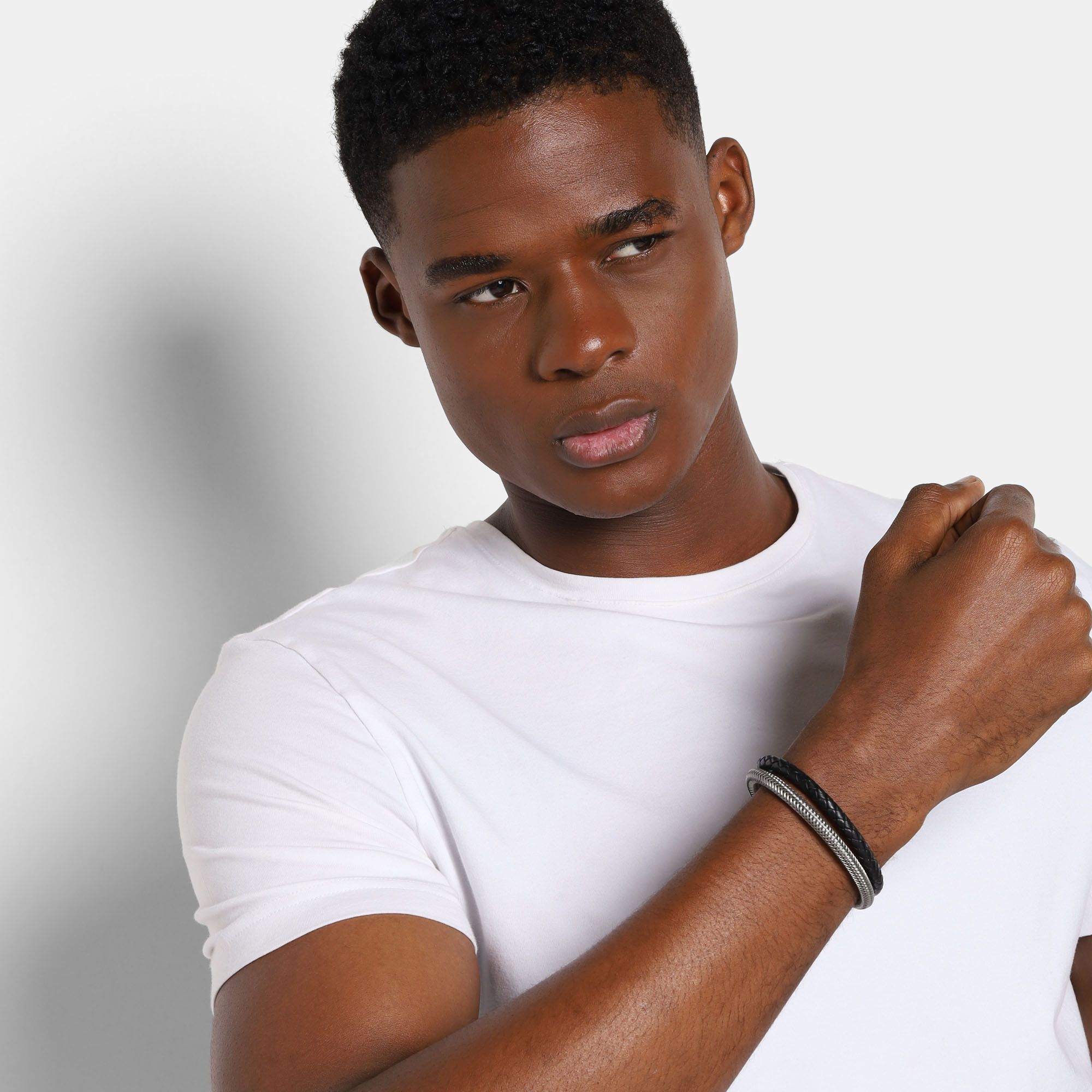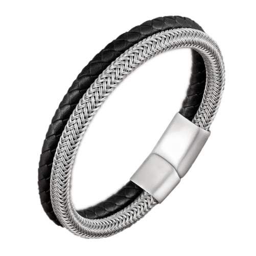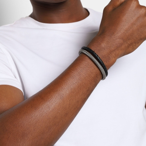 Pulsera doble de cuero color negro y acero inoxidable diseño trenzado.