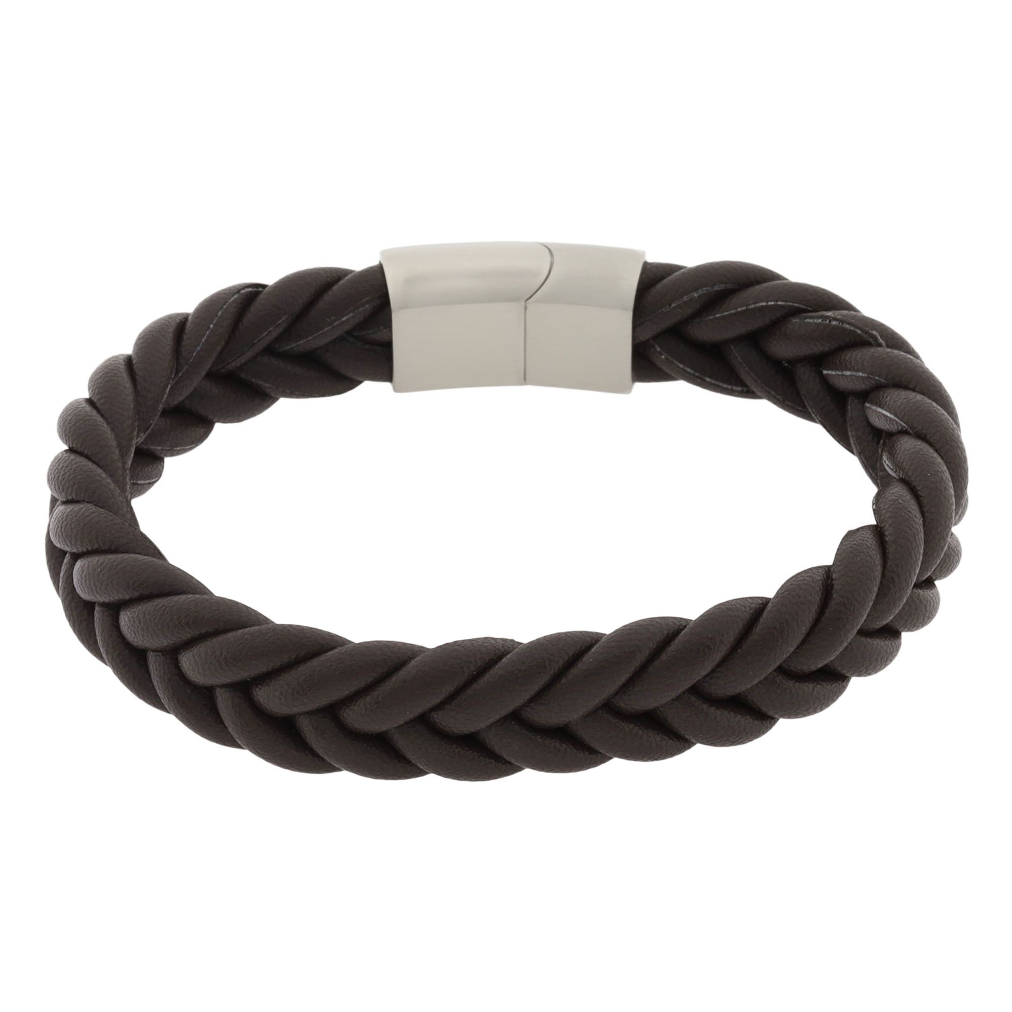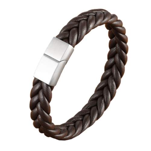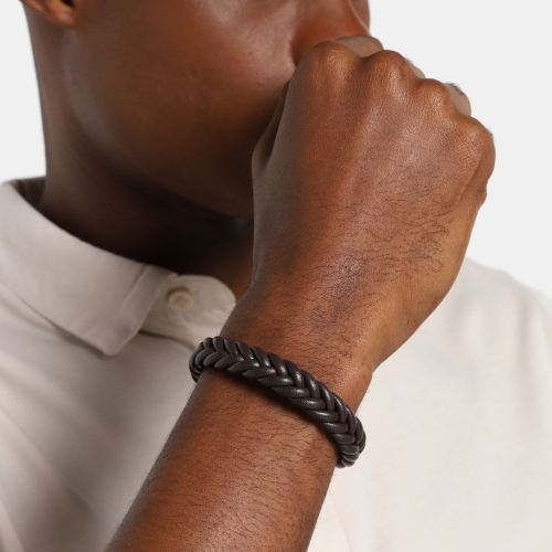 Pulsera de cuero color café diseño trenzado y broche en acero inoxidable.