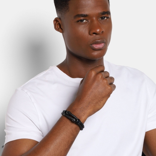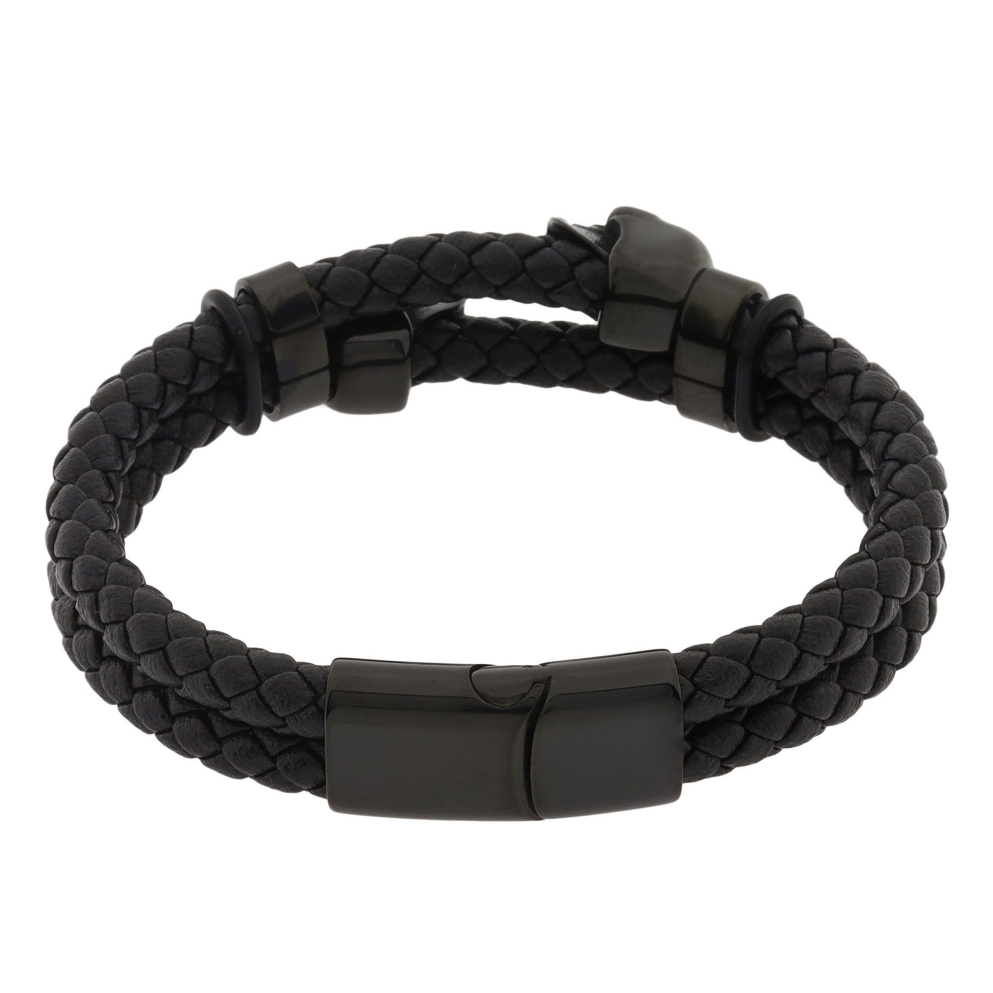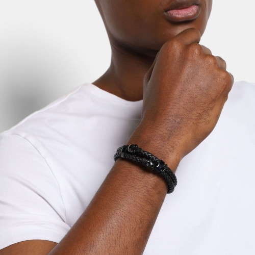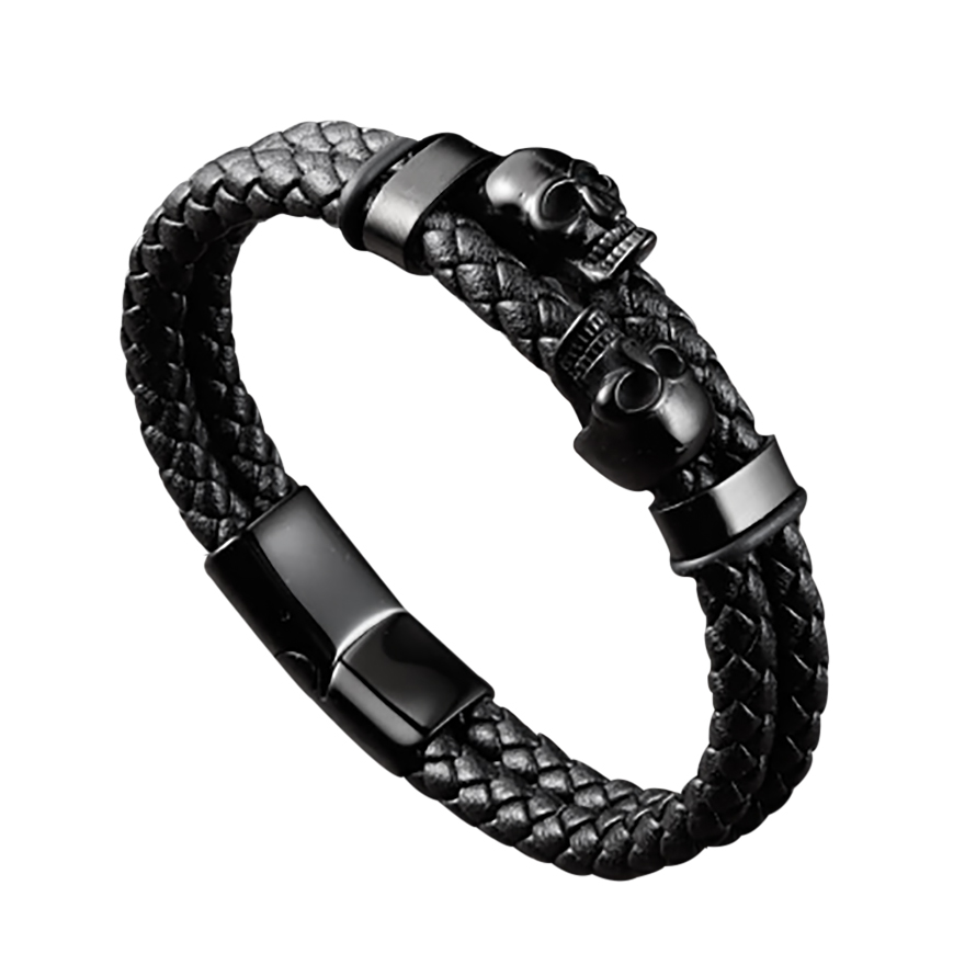 Pulsera estilo doble de cuero en color negro, detalle de calaveras y broche en acero inoxidable color negro.