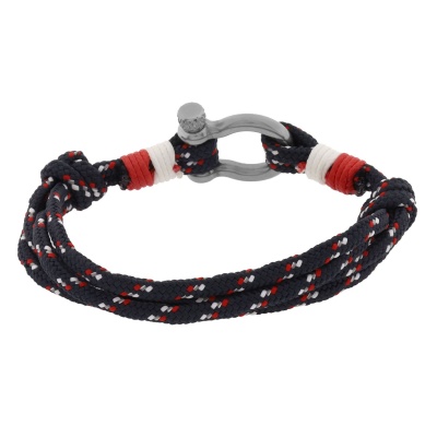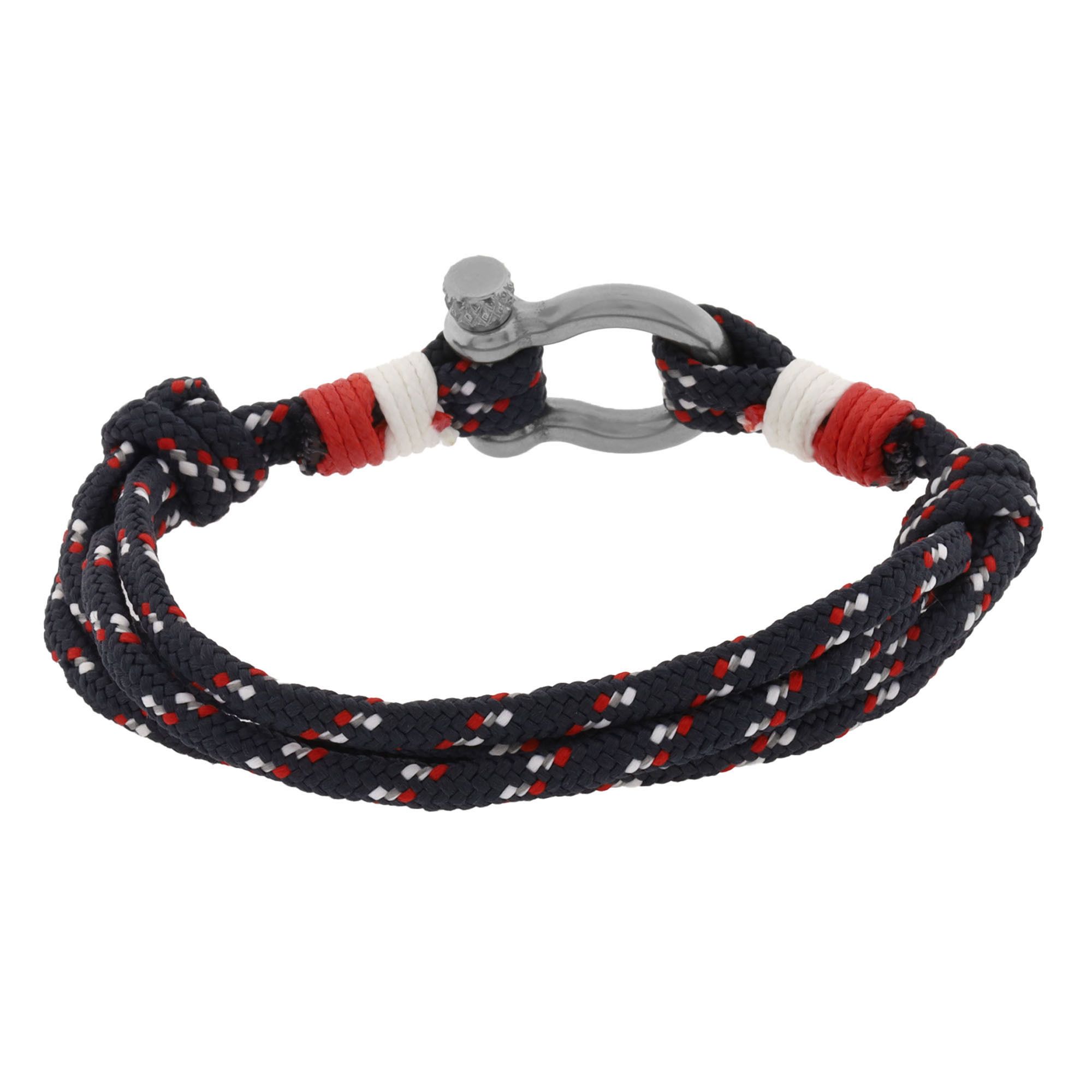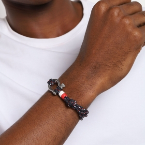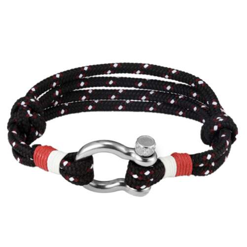 Pulsera de cuerda en color negro, blanco y rojo estilo de nudo corredizo, con detalle en el broche de tornillo de acero inoxidable.