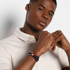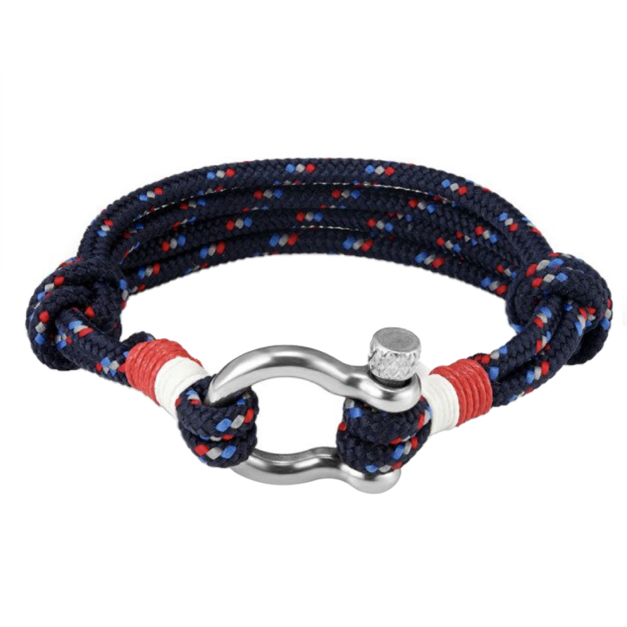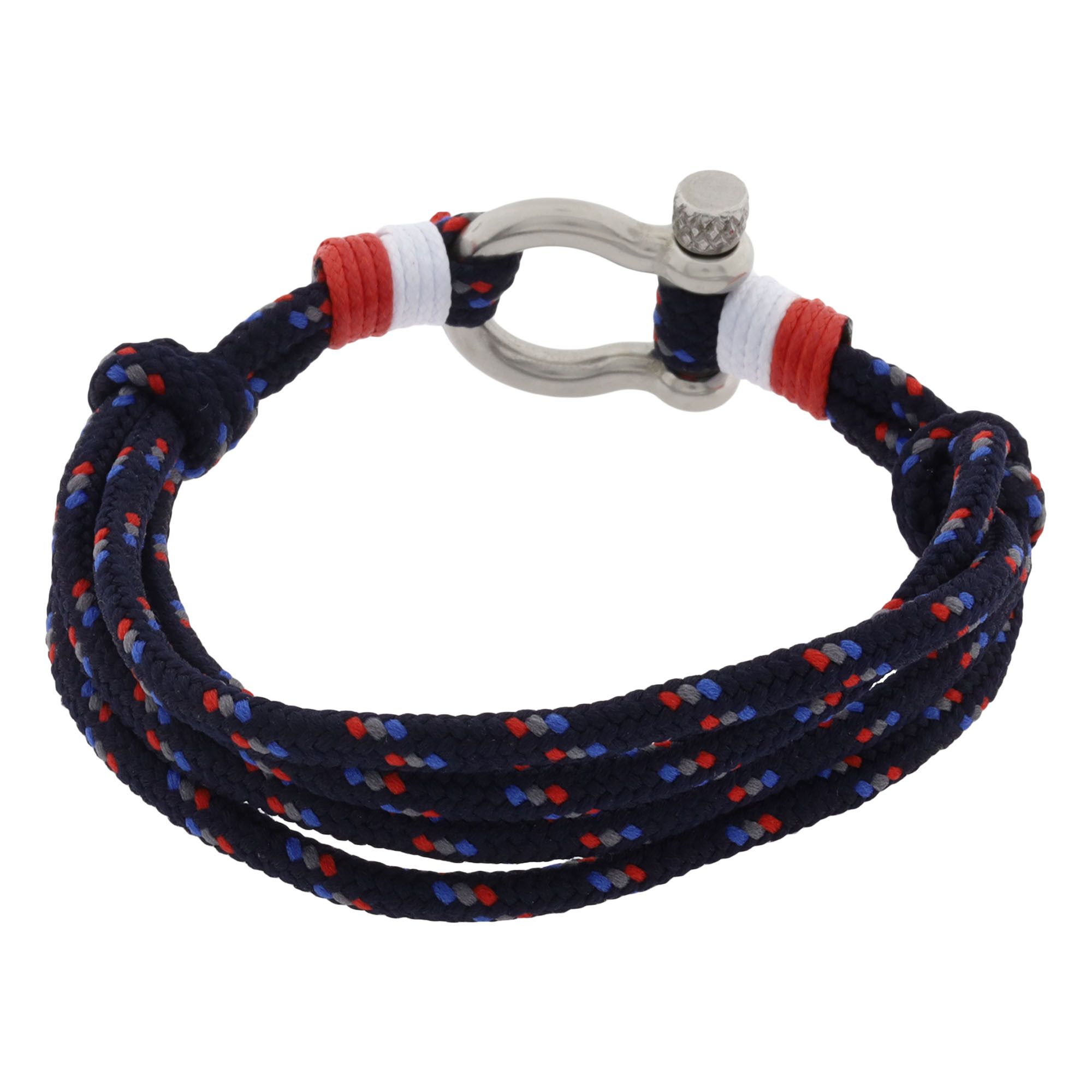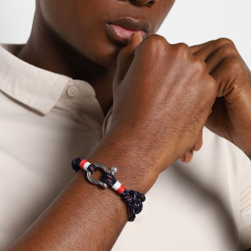 Pulsera de cuerda en color azul marino y rojo estilo de nudo corredizo, con detalle en el broche de tornillo de acero inoxidable.