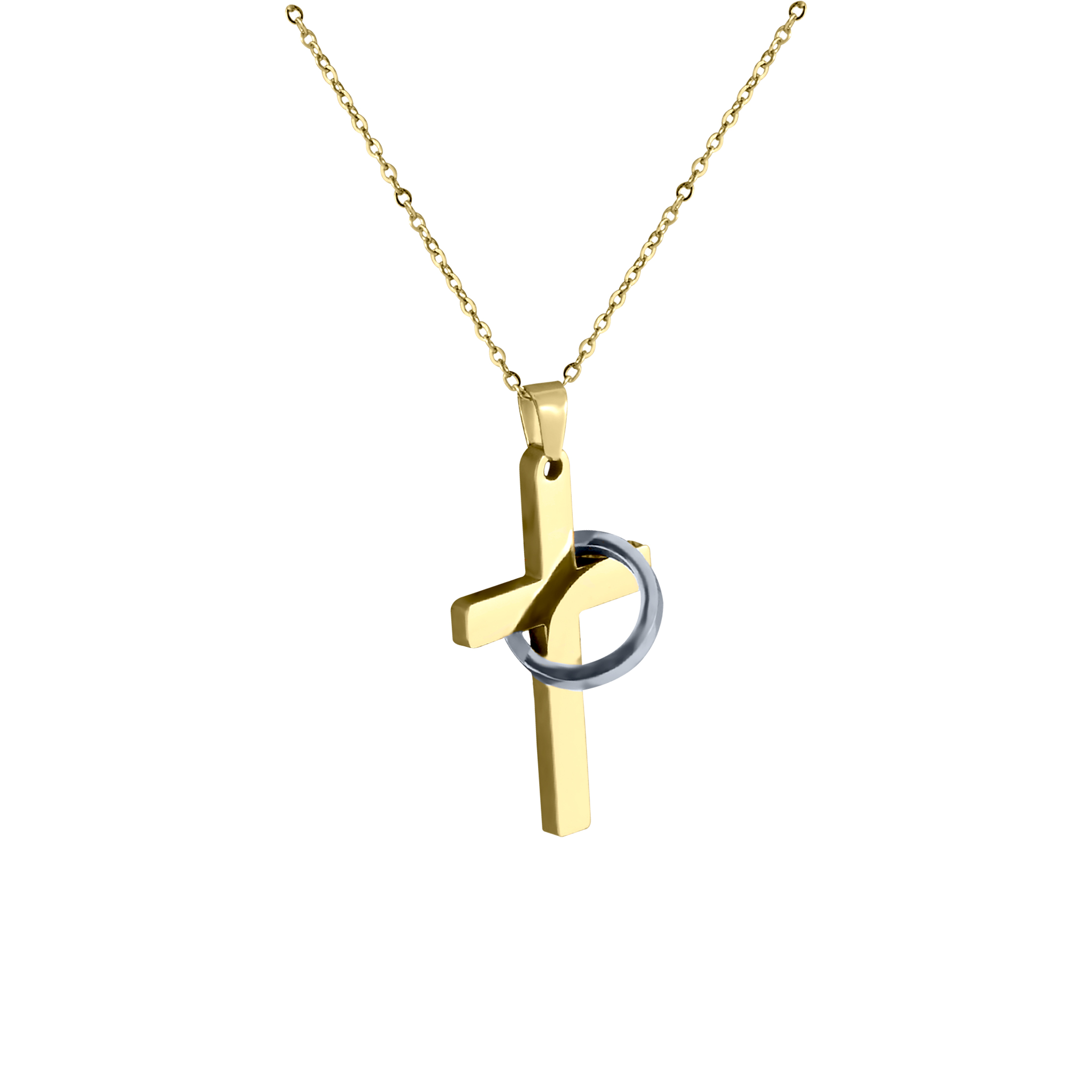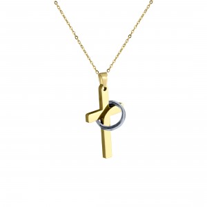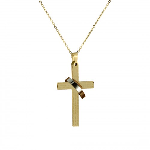 Dije de acero inoxidable en color amarillo y blanco, con grabado del padre nuestro y aro que cubre la cruz.