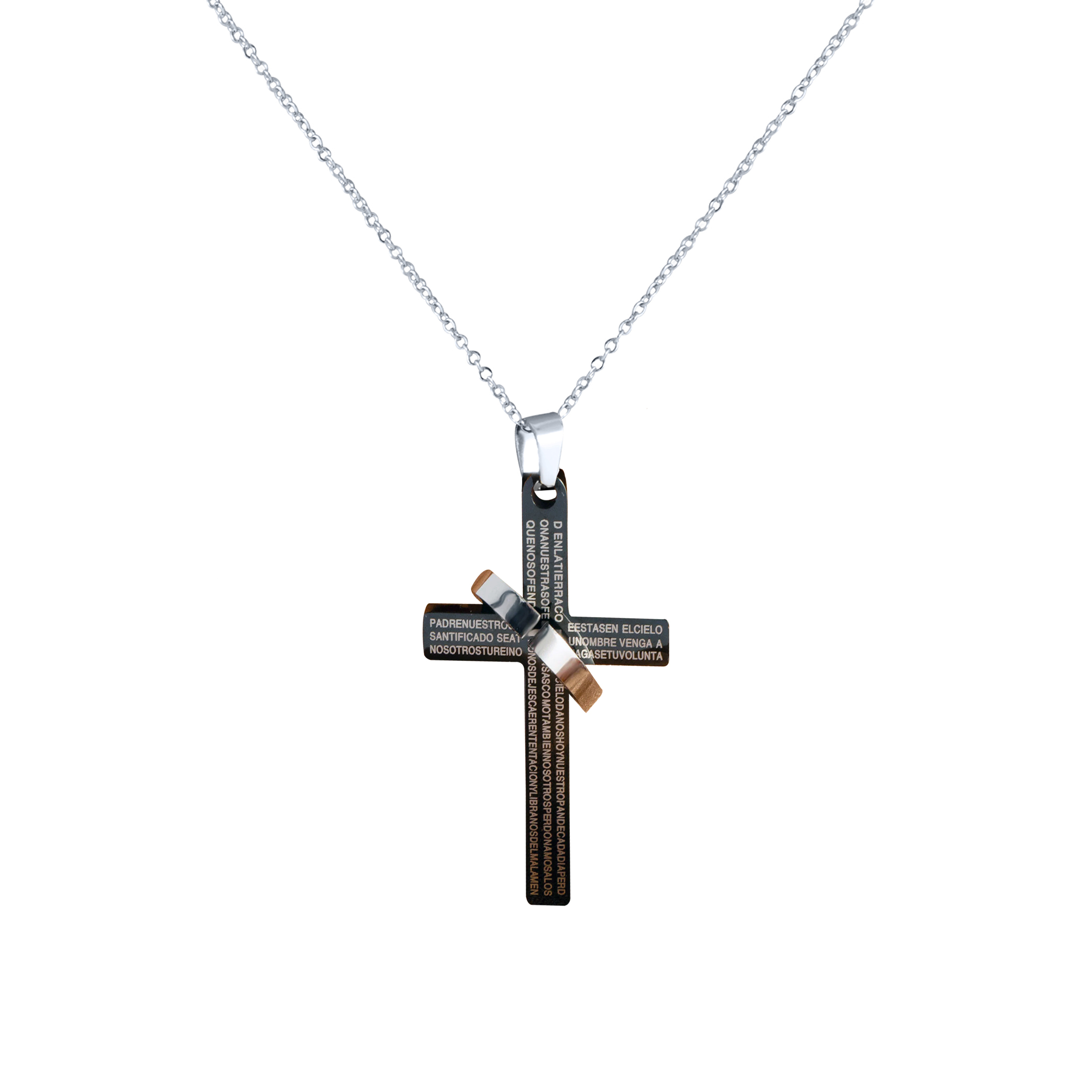 Dije de acero inoxidable en color blanco y negro, con grabado del padre nuestro y aro que cubre la cruz.