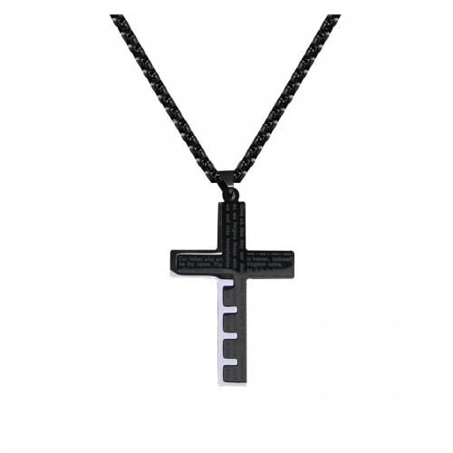 Dije de acero inoxidable diseño de cruz en color negro, con grabado del padre nuestro.