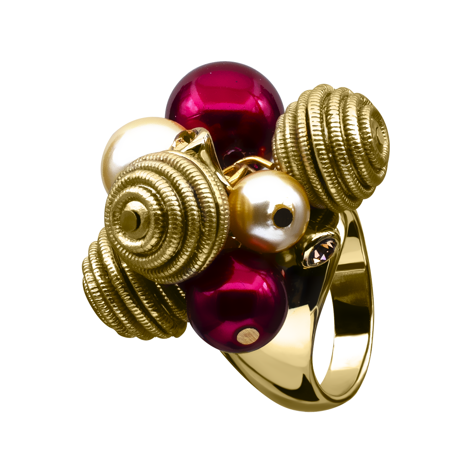 Colorido anillo, en baño de oro amarillo de 18 quilates, con perlas en rojo y miel, esferas doradas con relieve e incrustaciones de cristales blancos. Fabricado en una estructura de aleación de platino con rodio sin níquel.