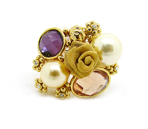 Exclusivo anillo en baño de oro amarillo de 18 quilates, con rosa dorada hecha de malla, cristales violeta y rosado, perlas beige, flores en relieve e incrustaciones de cristales blancos. Fabricado en una estructura de aleación de platino con rodio sin níquel.