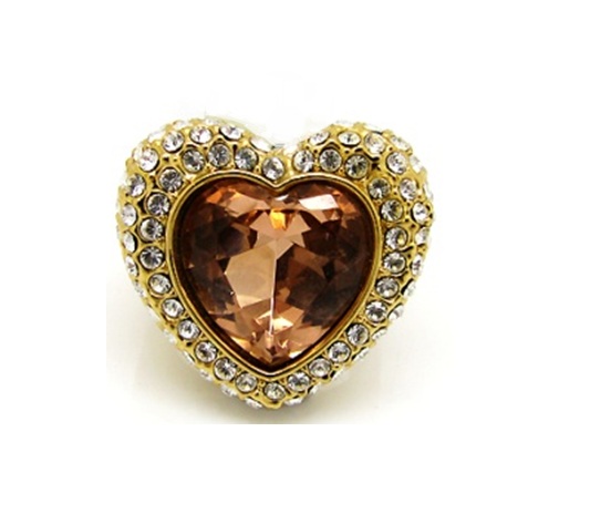 Anillo en baño de oro amarillo de 18 quilates, bello diseño, con corazón de cristal color ámbar e incrustaciones de cristales blancos.
