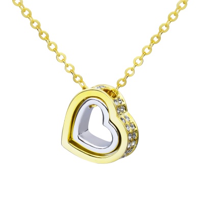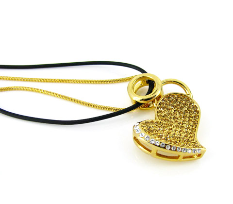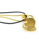 Original dije con cadena en baño de oro amarillo de 18 quilates con corazón estilizado, cadena dorada, correa negra e incrustaciones de cristales blanco. Fabricado en una estructura de aleación de platino con rodio sin níquel.