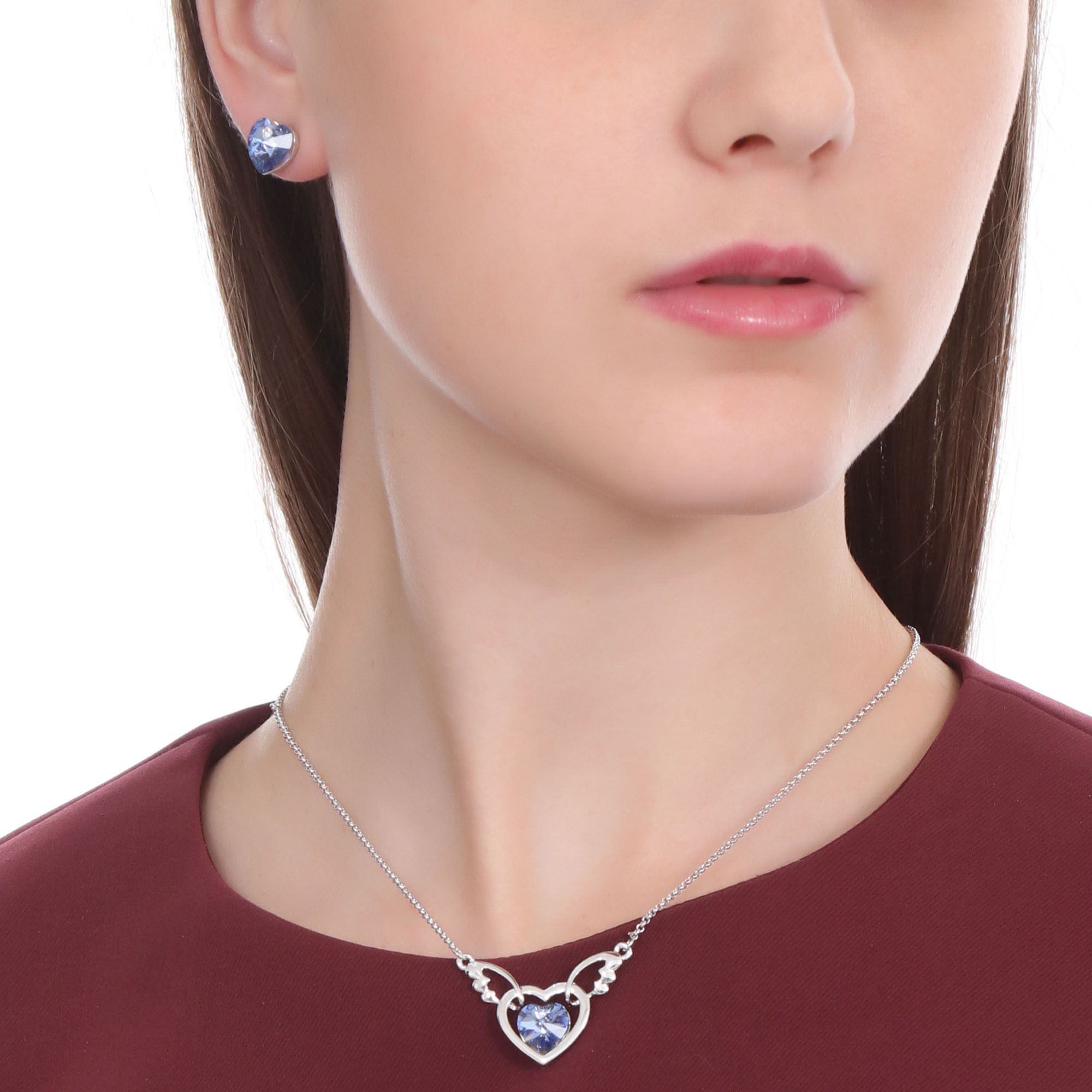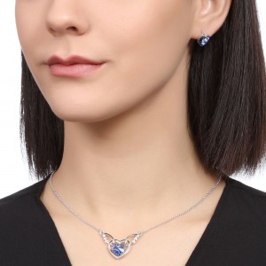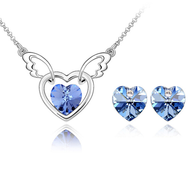 Elegante juego de aretes y dije con cadena diseño en baño de oro blanco de 18 quilates, diseño de corazón con alas y cristales en color azul. Fabricado en una estructura de aleación de platino con rodio sin níquel.