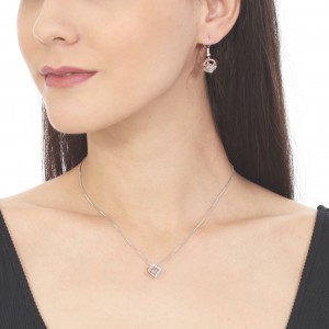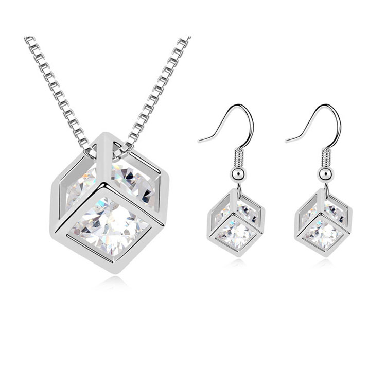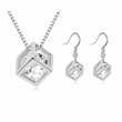 Lindo juego de aretes y dije en baño de oro blanco de 18 quilates , diseño de cubo cristal blanco dentro. Fabricado en una estructura de aleación de platino con rodio sin níquel.