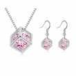 Hermoso juego de aretes y dije con cadena en baño de oro blanco de 18 quilates , fino diseño de cubo con cristal en color rosa dentro. Fabricado en una estructura de aleación de platino con rodio sin níquel.