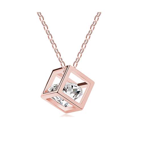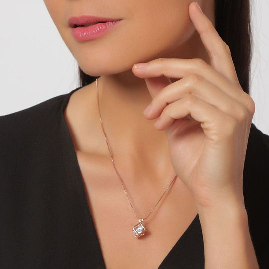 Precioso dije en baño de oro rosa de 18 quilates, con cristal dentro de un cubo. Fabricado en una estructura de aleación de platino con rodio sin níquel.