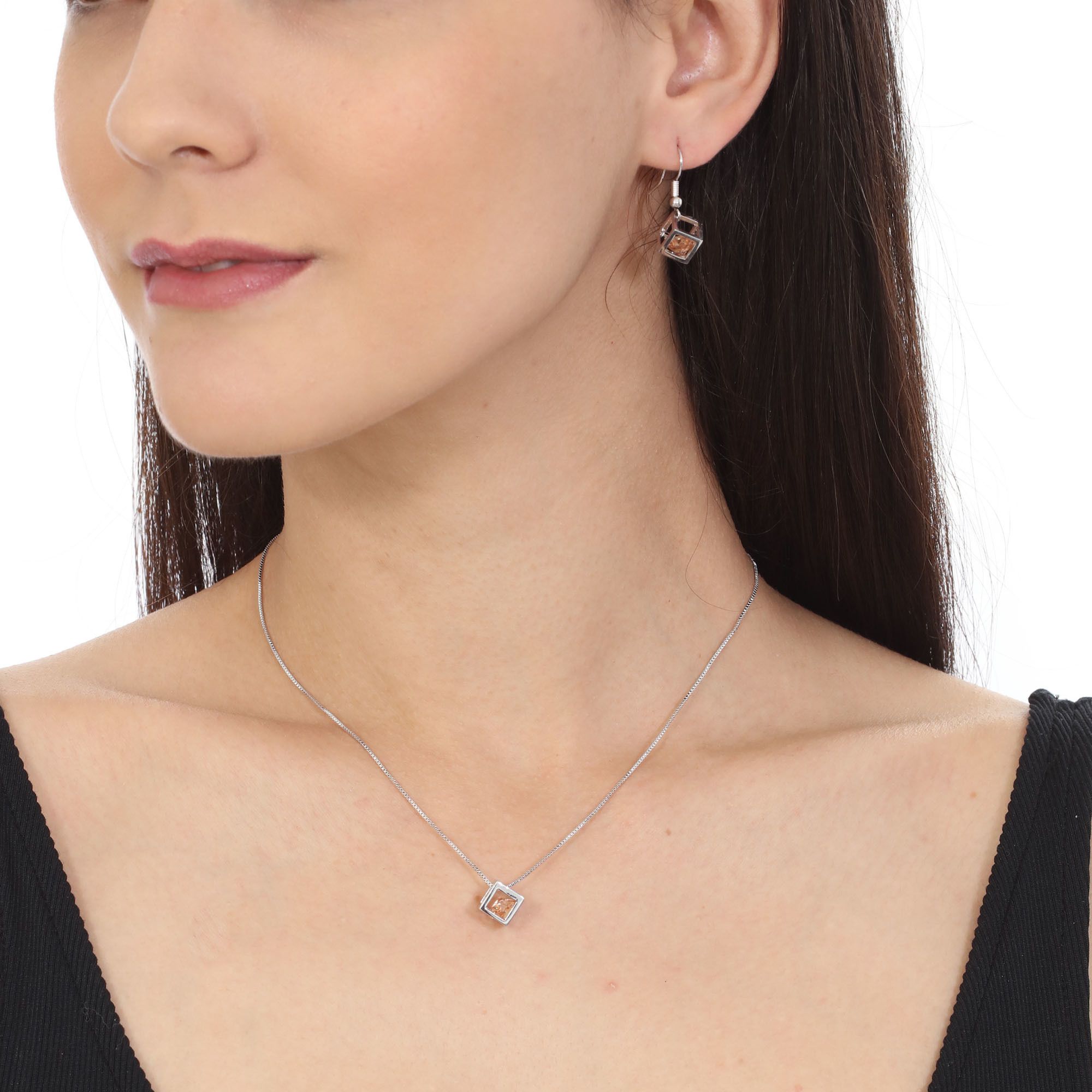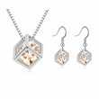 Hermoso juego de aretes y dije en baño de oro blanco de 18 quilates , fino diseño de cubo con cristal en color ámbar dentro. Fabricado en una estructura de aleación de platino con rodio sin níquel.