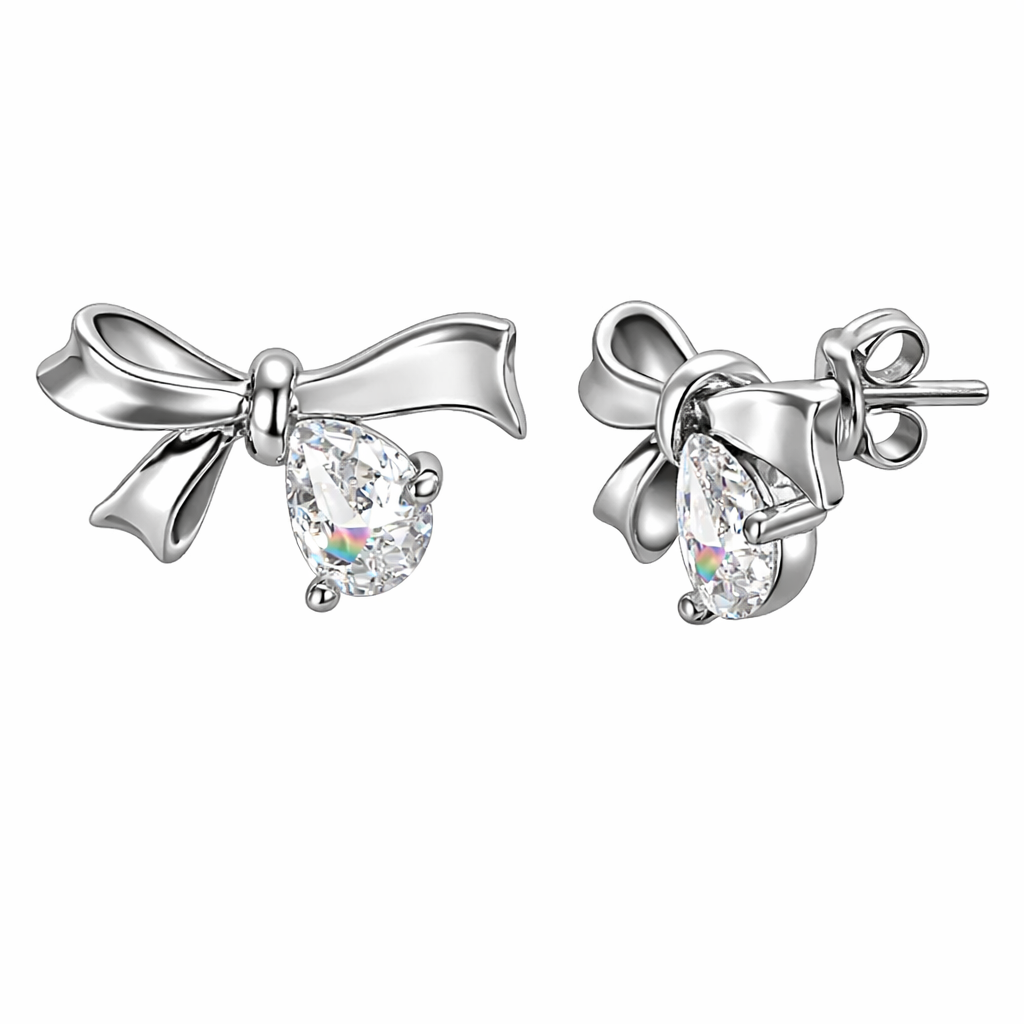 Elegantes aretes en baño de oro blanco de 18 quilates, en diseño de moño con incrustaciones de cristales en color blanco. Fabricado en una estructura de aleación de platino con rodio sin níquel.