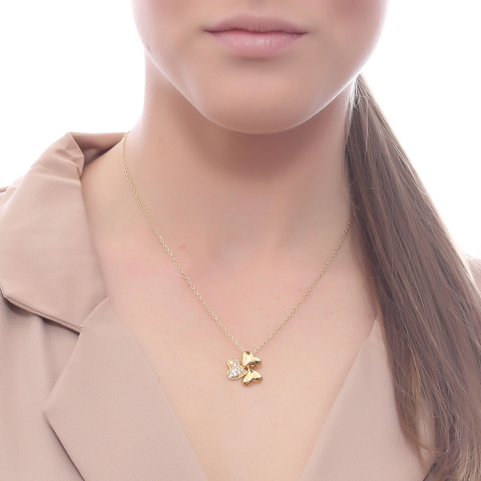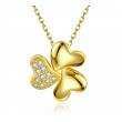 Dije en baño de oro amarillo de 18 quilates, fino diseño de trébol con incrustaciones de cristales en color blanco. Fabricado en una estructura de aleación de platino con rodio sin níquel.