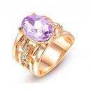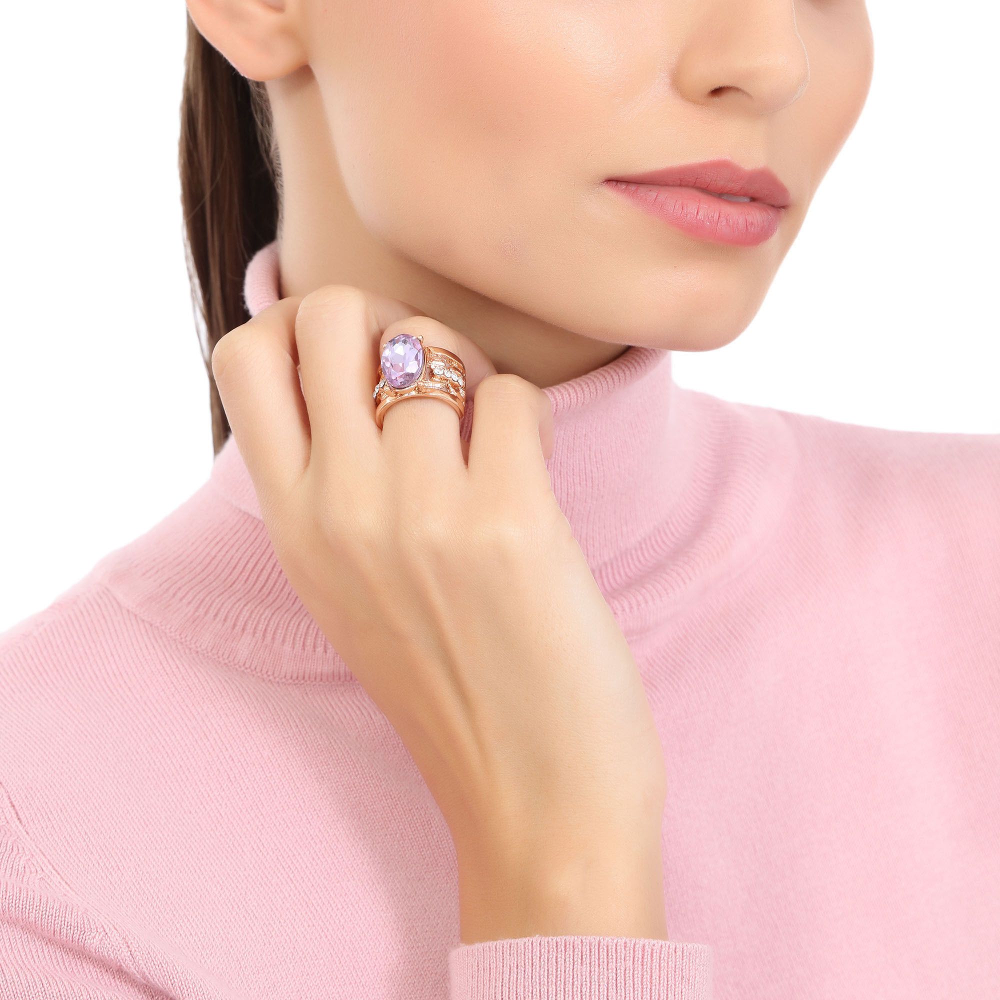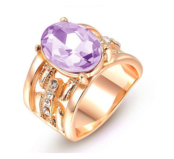 Elegante anillo en baño de oro rosa de 18 quilates, fino diseño con icristal lila corte oval, detalles en relieve e ncrustaciones de cristales blancos. Fabricado en una estructura de aleación de platino con rodio sin níquel.