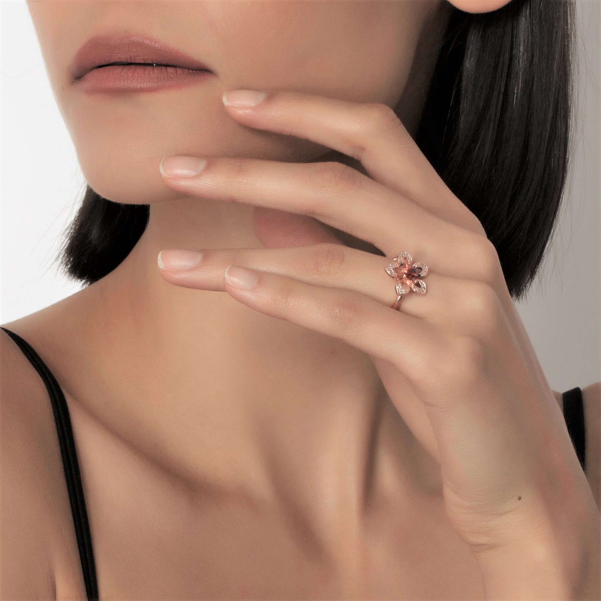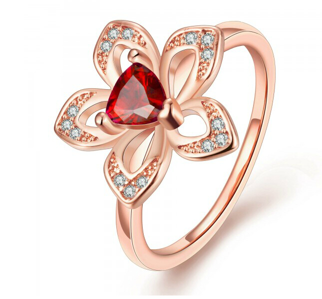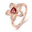 Lindo anillo en baño de oro rosa de 18 quilates, diseño de flor con cristal rojo corte trillion e incrustaciones de cristales blancos. Fabricado en una estructura de aleación de platino con rodio sin níquel.