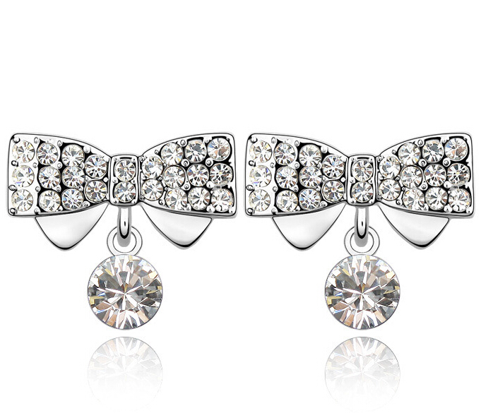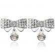Preciosos aretes en baño de oro blanco de 18 quilates, diseño de moño con incrustaciones de cristales en color blanco. Fabricado en una estructura de aleación de platino con rodio sin níquel.