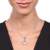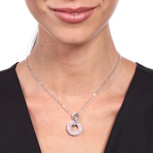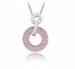 Dije con cadena en baño de oro blanco de 18 quilates, diseño de círculo con incrustaciones de cristales en color rosa. Fabricado en una estructura de aleación de platino con rodio sin níquel.